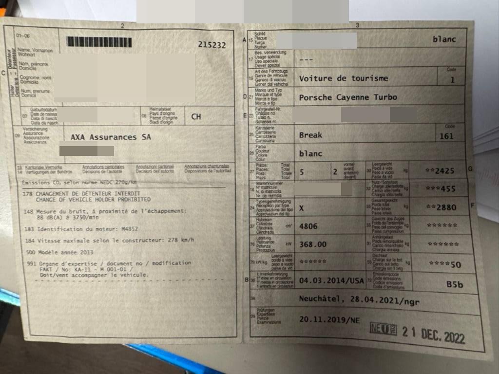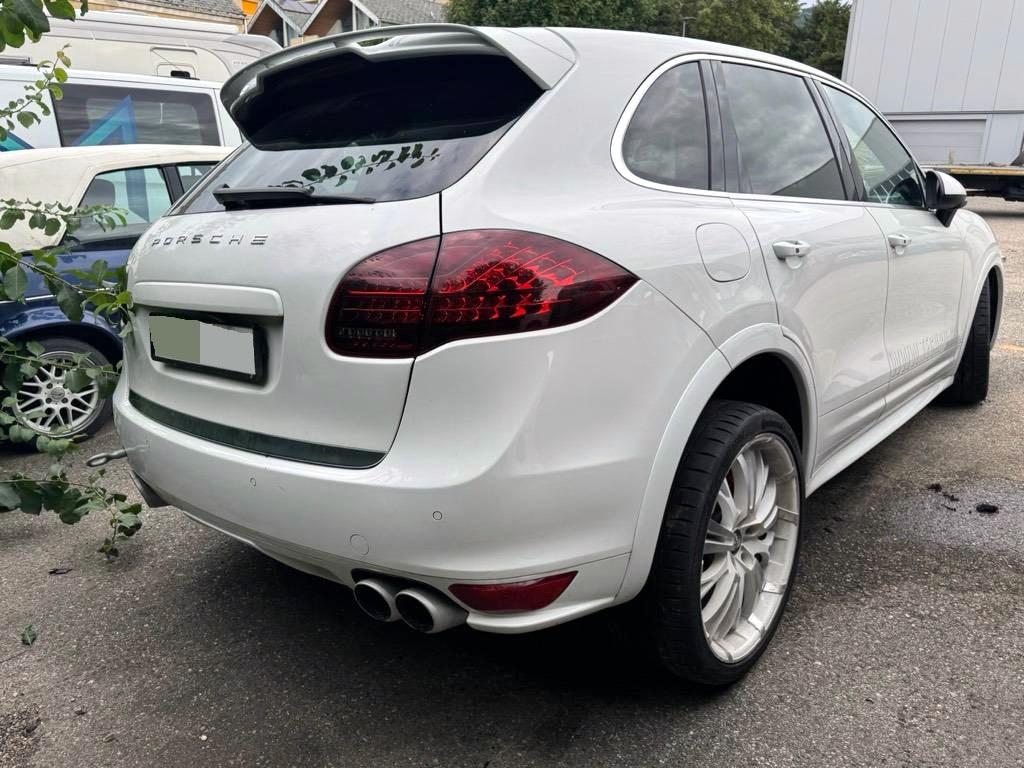 Sitze: Sitzheizung vorne und hinten, Licht: LED Heckleuchten, Multifunktionsanzeige, ISOFIX Kindersitzvorrichtung, 3-Punkt-Sicherheitsgurte auf allen Plätzen, Licht: Fahrlichtassistent (automatisches Fahrlicht), Steckdose 12V, Sitze: Komfortsitze vorne elektr. verstellbar, Mittelkonsole mit Ablagefach, Vorbereitung für Anhängevorrichtung, Airbag: Airbag Fahrer und Beifahrer, Digital Uhr, Fahrstabilisierungssystem Porsche - Stability-Management (PSM), Drehzahlmesser, Antiblockiersystem (ABS), Park Distance Control vorne und hinten, Bremsbelag-Verschleissanzeige, Getönte Scheiben, Adaptives Bremslicht, Tageskilometerzähler, Innenspiegel und Aussenspiegel links automatisch abblendend, Katalysator geregelt, Aktivkohlefilter, Assist: Tempomat, Antriebsschlupfregelung (ASR), Auspuffanlage mit 2 Endrohren (links und rechts), Türgriffe aussen in Wagenfarbe, Kofferraum-Entriegelung von innen, Aussenspiegel rechts und links beheizt, elektrisch verstell- / und einklappbar, Fussraumbeleuchtung vorne und hinten, Kraftstofftank 100 Liter, Räder: Reifendruckkontrollsystem ( RDK ), Bremsassistent (BAS), Aussentemperaturanzeige, Heckscheiben-Wisch-/Waschanlage, Porsche Communication Management (PCM) - inklusiv erweitertem Navigationsmodul, Lederausstattung Glattleder einfarbig, Wegfahrsperre elektronisch, Steckdose, Innenlicht-Abschaltverzögerung, Licht: Nebelschlussleuchte, Scheibenwischer vorne mit Intervall, Reduktionsgetriebe, Nichtraucherausführung, Diebstahlwarnanlage mit Innenraumüberwachung, Aluminium-Paket, Ablagefach in Armlehne hinten, Airbag: Airbag Beifahrer deaktivierbar, 3 Kopfstützen hinten, Airbag: Seitenairbag für Fahrer und Beifahrer, Media: Bose Surround Soundsystem, Servolenkung, Assist: Porsche Traction Management (PTM), Zentralverriegelung mit Fernbedienung, Assist: Seitenaufprall-Schutzsystem, Porsche Active Suspension Management (PASM): Luftfederung inkl. Niveau- regulierung, Lenkradheizung, Metallapplikationen, Heckscheibenheizung, Elektronische Parkbremse, Wartungsintervall-Anzeige, 4 Leichtmetallräder Cayenne Turbo Rad 19J, Gurtwarneinrichtung für Fahrer- und Beifahrersitz, Räder: Reifenreparatur-Set mit Kompressor, Klimatisierungsautomatik, 6-Kolben-Aluminium-Monobloc-Festsattelbremsen vorne, Ausstiegsleuchten in den Türen, Lackierung: Metallic-Lackierung, Dachhimmel in Alcantara, Einstiegsschienen vorne, Gurtstraffer vorne und hinten, Zweiklanghorn, Bordcomputer, Getriebe: 8-Stufen-Automat sequentiell, Armauflage Mittelkonsole vorn mit integriertem Ablagefach, Leseleuchten hinten, Vordersitze höhenverstellbar, Adaptive Sportsitze inkl. Komfort- Memory-Paket, Laderaumabdeckung, Airbag: Window-Kopfairbags, Tankdeckel-Entriegelung von innen, Höhenverstellbare Gurten vorne, Leseleuchten vorne, Automatikgurt in Fondmitte, Dachspoiler, Elektrische Fensterheber vorne + hinten, Bi-Xenon-Scheinwerfer inkl. Porsche Dynamic Light System (PDLS), Allradantrieb permanent, Sitze: Rücksitzlehne geteilt abklappbar, Licht: LED Blink- und Positionsleuchten, Oeldruckanzeige