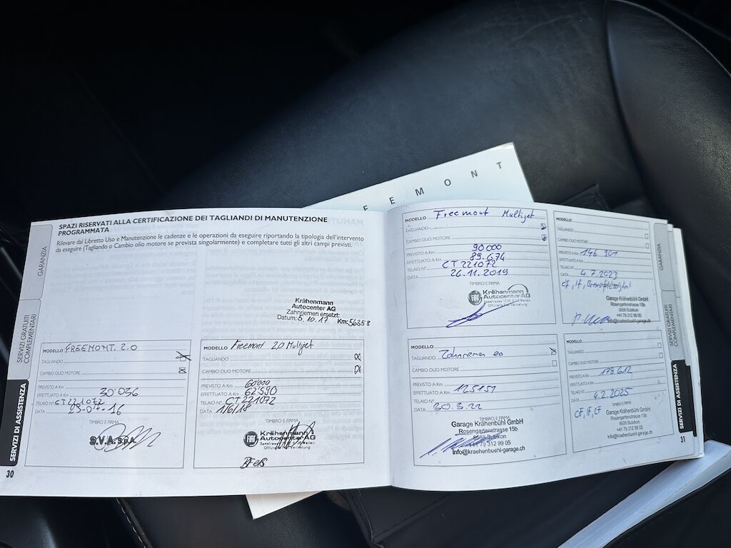 4 Winterkompletträder auf 17″-Alufelgen (Fiat-Originalfelgen)Nichtraucherauto1 Satz Schneeketten (ungebraucht)DAB+ AdapterLetzte MFK: 27.09.2024, Diesel-Partikelfilter ersetztLetzter Service: 04.02.2025, bei Stand Km 178’612 Grosser Service 25.06.2025, KlimaserviceBekannte Mängel: Rost an der Motorhaubenkante, Farbe platzt aufLetzte Reparatur: 26.08.2025 Bremsflüssigkeit auffüllen (wenig Druck in der Hydraulik, gab Probleme beim Schalten)