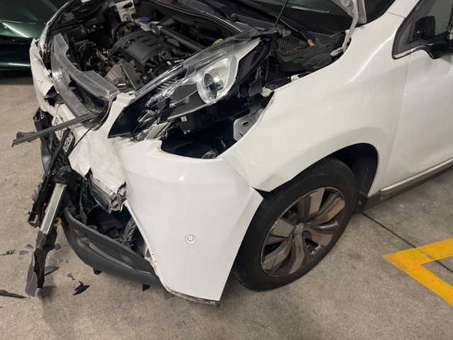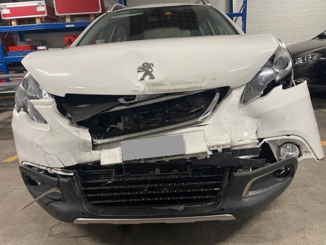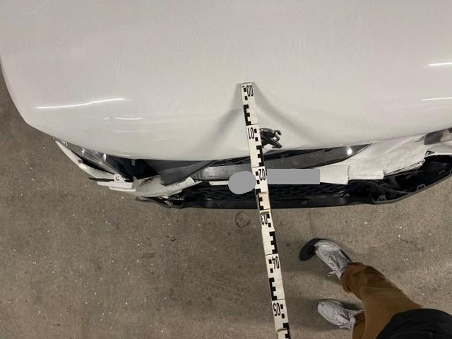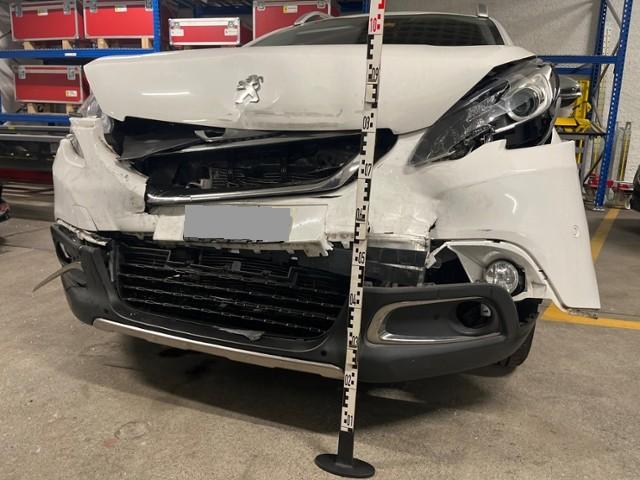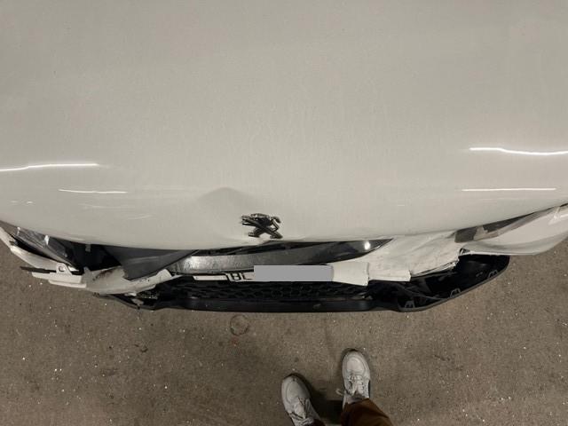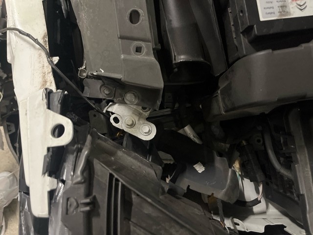 Front eingedrückt. Längsträger vorne rechts und links gestaucht. Fahrzeugvorbau verschoben.