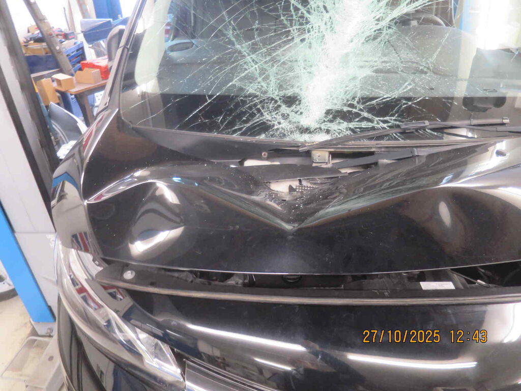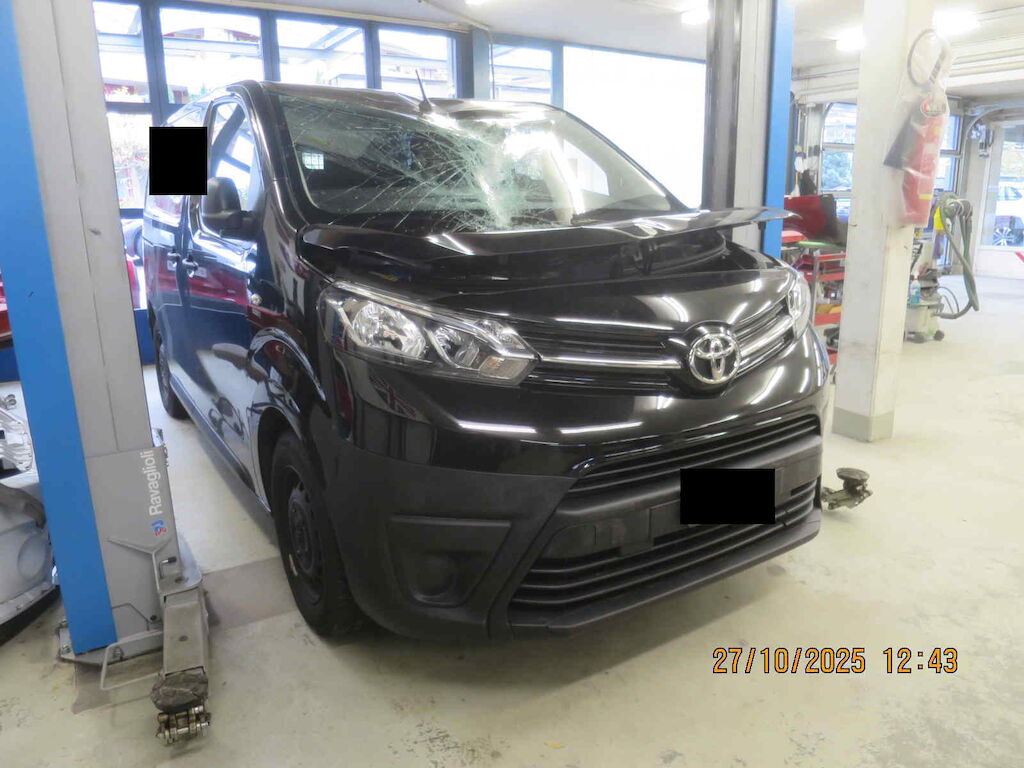 Motorhaube inkl. Wasserkasten stark deformiert, Frontscheibe gebrochen, Dach stark deformiert, Spiegel li abgebrochen, Dachrahmen li, beide Türe links und Seitenwand hl Dellen und Lackschäden, Dachhimmel beschädigt Motor Getriebe Vorderachse Hinterachse Airbags ausgelöst: 0 unbekannt ( Abfallcode 16.01.04ak )