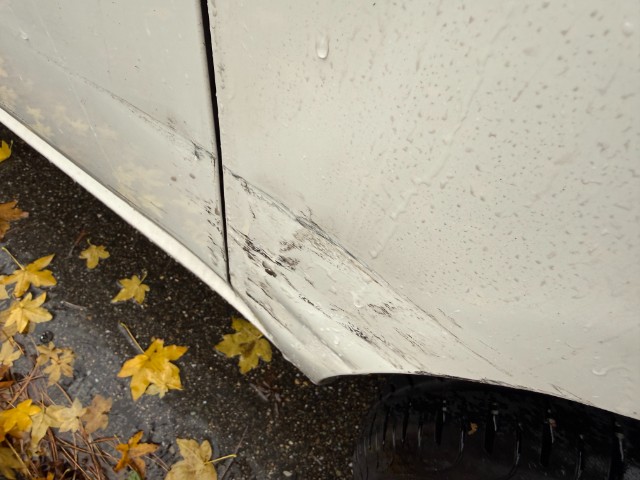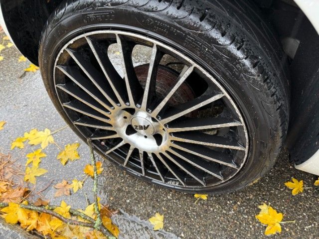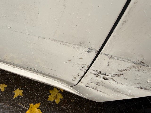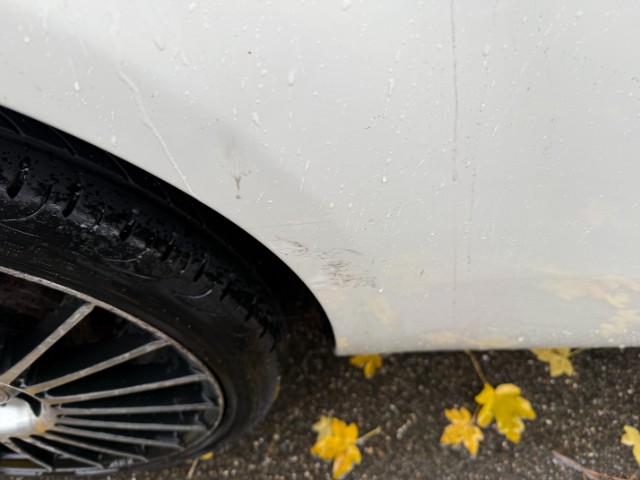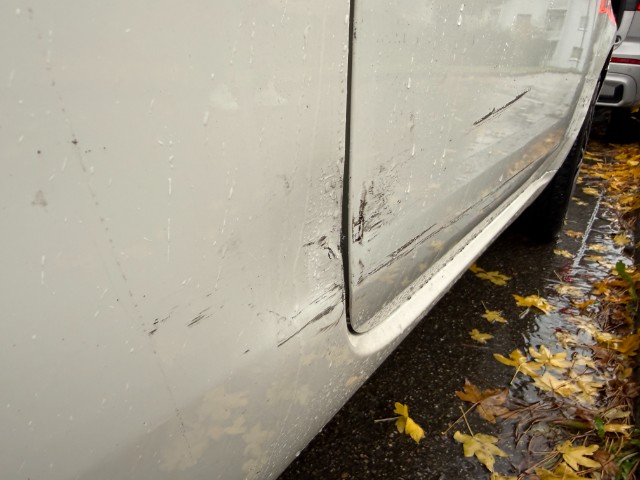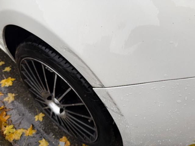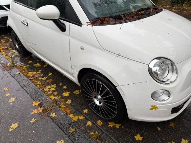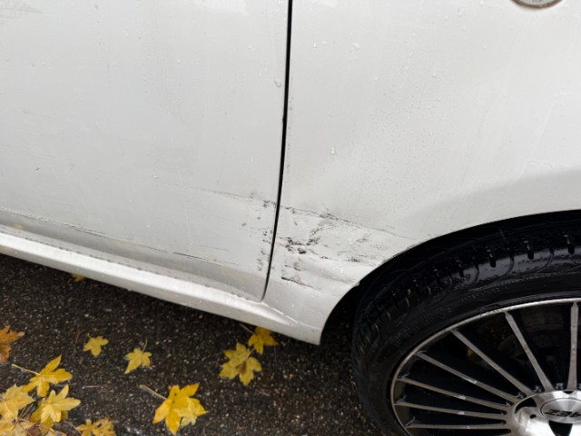 Ganze rechte Seite wurde beschädigt, Kotflügel, Türe und Seitenwand eingedrückt, Stossfänger vorne und beide Felgen verkratzt.
