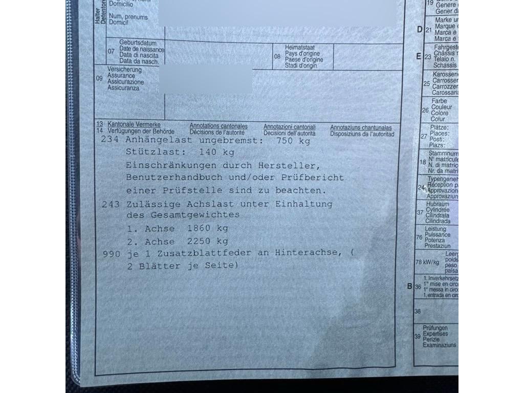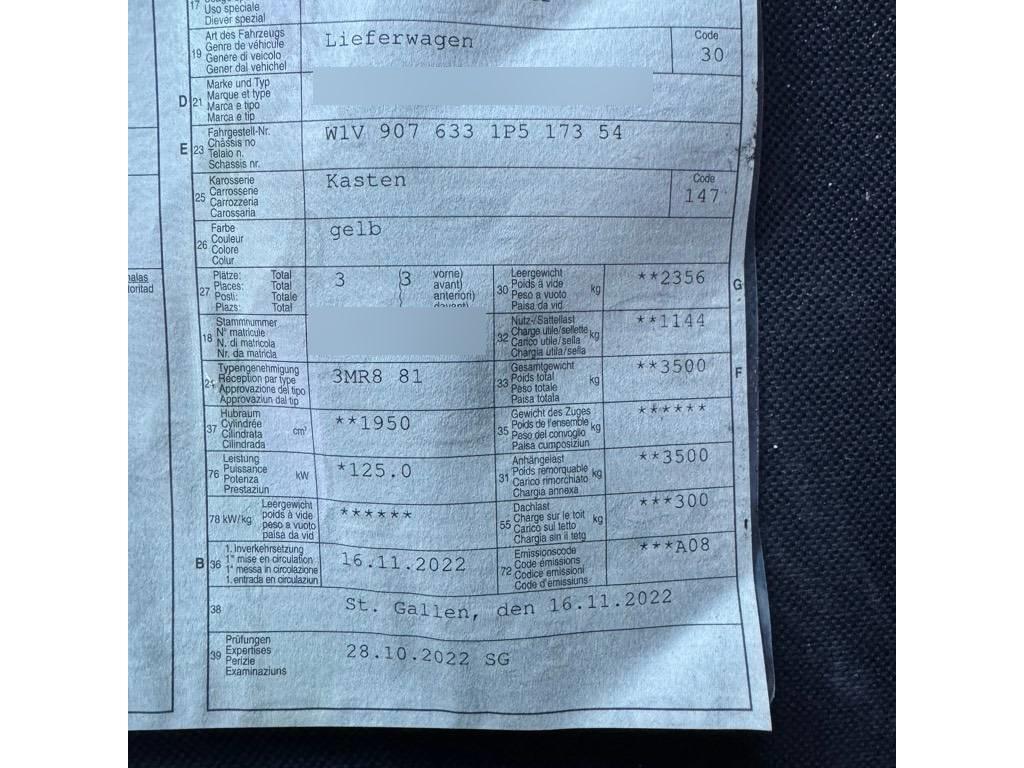 Licht: 3. Bremsleuchte, Abgasreinigung SCR Generation 4, Getriebe: Achsübersetzung i = 4,727, Elektrische Klemmleiste, Assist: Pannenmanagement, Vorrüstung Schalterfeld, Längsträgerverstärkung, Türen: Laderaum-Schiebetür rechts, Wagenheber, Sitze: Komfort-Fahrersitz, Generator 14 V / 250 A, Assist: Elektronisches Stabilitäts-Programm (ESP), Vliesbatterie 12 V/92 Ah, Vorrüstung Elektrik, parametrierbares Sondermodul, Anhängersteckdose 13-polig, Starthilfe - Kontakt, Licht: Fahrlichtassistent (automatisches Fahrlicht), Airbag: Airbag Fahrerseite, Licht: Deckenleuchte(n) LD-/FG-Raum mit Türkontakt, Lackierung: Uni-Lackierung, Tachometer km/h, Servolenkung, Ablagefach über der Frontscheibe, Emissionsklasse Euro 6d-TEMP N1 GR.III/N2, Fahrzeug- Vorrüstung für AH-Last bis 3500 kg, Trennwand durchgehend, Sommerreifen, ohne Auf-/Ablastung 3.500 kg, Getriebe: ECO Start-Stopp-Funktion, Assist: Mercedes-Benz Notrufsystem, Elektrik für Anhängersteckdose, Haupttank 71 Liter, Licht: Adaptives Bremslicht, Kleiderhaken im Fahrerhaus, Reserveradhalter unter Rahmenende, Fahrwerk: Stabilisierung Stufe I, Haltegriff Einstieg Laderaumschiebetür an Trennw., Schmutzfänger hinten, Aussentemperaturanzeige, Räder: Stahlräder 6,5Jx16, Warndreieck, Media: Digitaler Radioempfang (DAB/DAB+), Rohbaumaßnahmen zusätzlich, Bereifung ohne Vorgabe Fabrikat, Garantie: Garantie: 2 Jahre, Getriebe: 9G-Tronic, Licht: Wegfall Parklicht, Dekor: Verkleidung des Laderaums bis Höhe Brüstungsgurt (Hartfaser), Assist: Seitenwind-Assistent, Media: Kommunikationsmodul (LTE) für digitale Dienste, Assist: Berganfahrhilfe, Zulassung N1, Reifen, rollwiderstandsoptimiert, Aussenspiegel heizbar und elektrisch verstellbar, Sitze: Beifahrersitz Zweisitzer, Schmutzfänger vorn, Polster: Polster Stoff Maturin schwarz, Hydraulik - Wagenheber, Dieselpartikelfilter, Wärmded. Glas mit Bandfilter an der Frontscheibe, Media: MB Audiosystem, Licht: Komfort-Dachbedieneinheit, Lenkrad: Lenkrad in Neigung und Höhe verstellbar, Gurtwarneinrichtung für Fahrersitz, Bereifung 235/65 R16 C, Räder: Reserverad Sichert die Mobilität im Fall einer Reifenpanne. Das Reserverad ist als Stahlrad mit 35,6 cm (14 Zoll) oder 38,1 cm (15 Zoll) erhältlich., Assist: Antiblockiersystem (ABS), Dekor: Holzfussboden im Laderaum, Geräuschmassnahmen, Warmluft-Zusatzheizung elektrisch