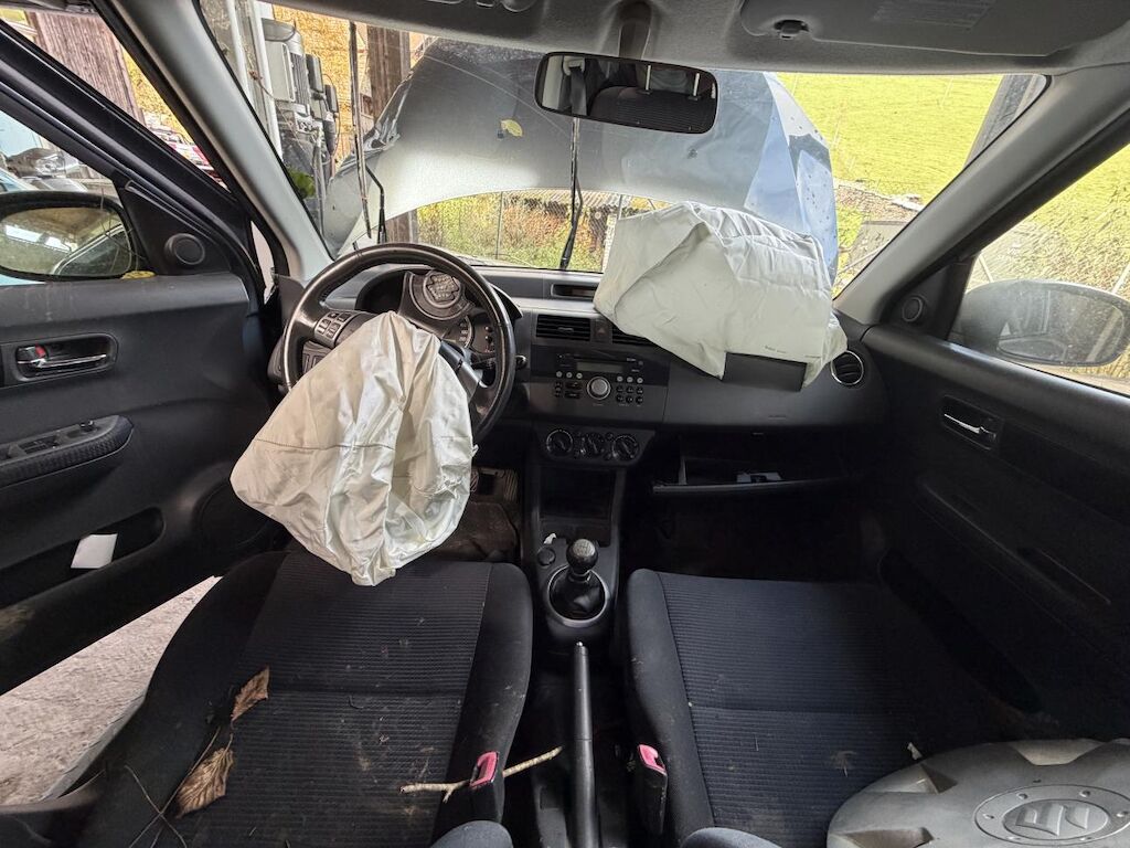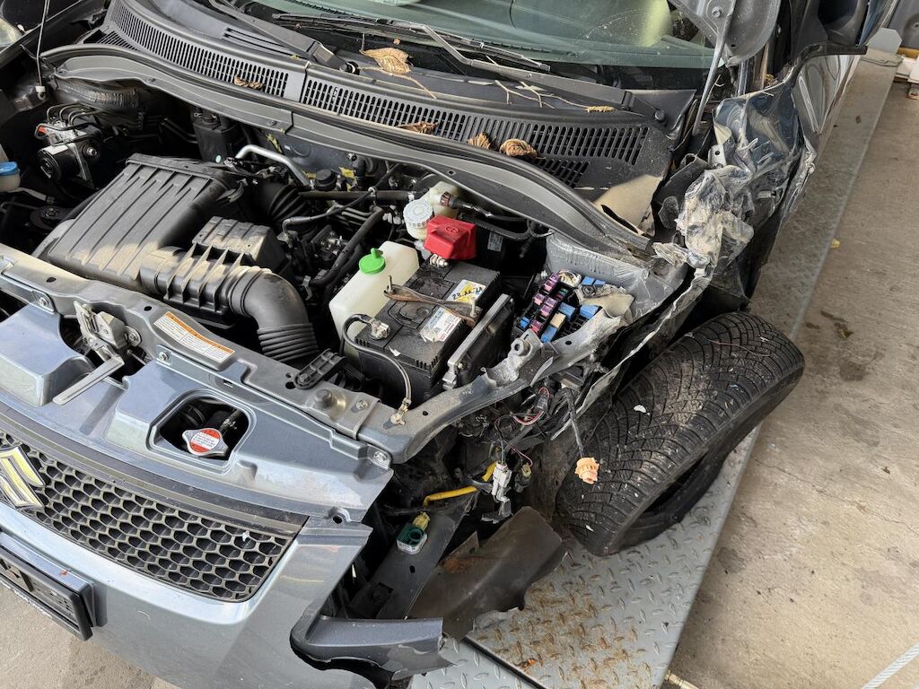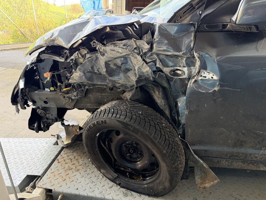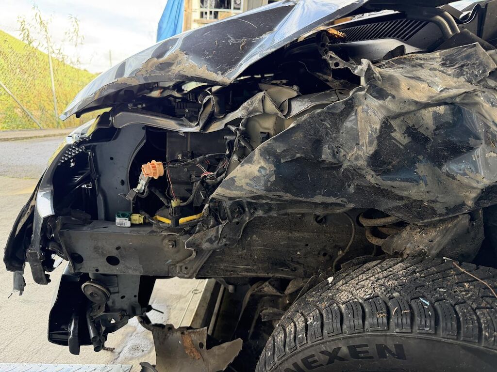 Frontalkollision links: Beide Airbag vorne ausgelöst, Massiver Schaden vorne links (Motorhaube, Radaufhängung, Stossstange etc.) Motor läuft nicht, Fahrzeug ist nicht fahrbar und muss aufgeladen werden, Nach Frontalkollision rutsche das Fahrzeug in einen Bach, div. beschädigte Fahrzeugteile von Ästen und Steinen. (Siehe Fotos) Motor Getriebe Vorderachse Hinterachse Airbags ausgelöst: 2 unbekannt ( Abfallcode 16.01.04ak )