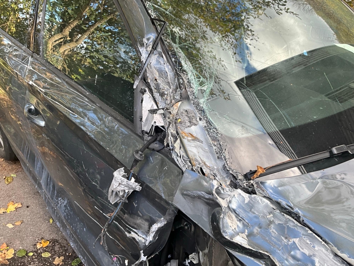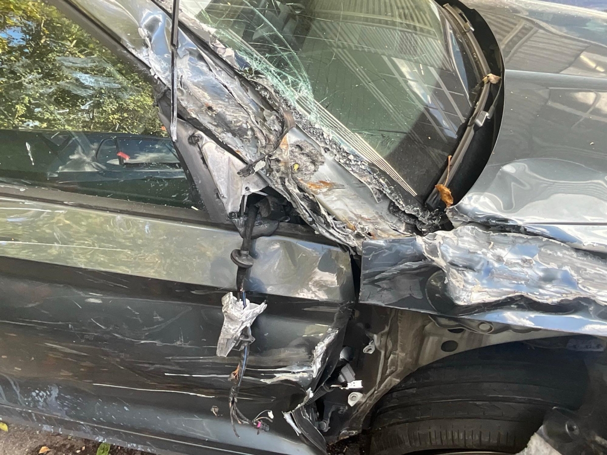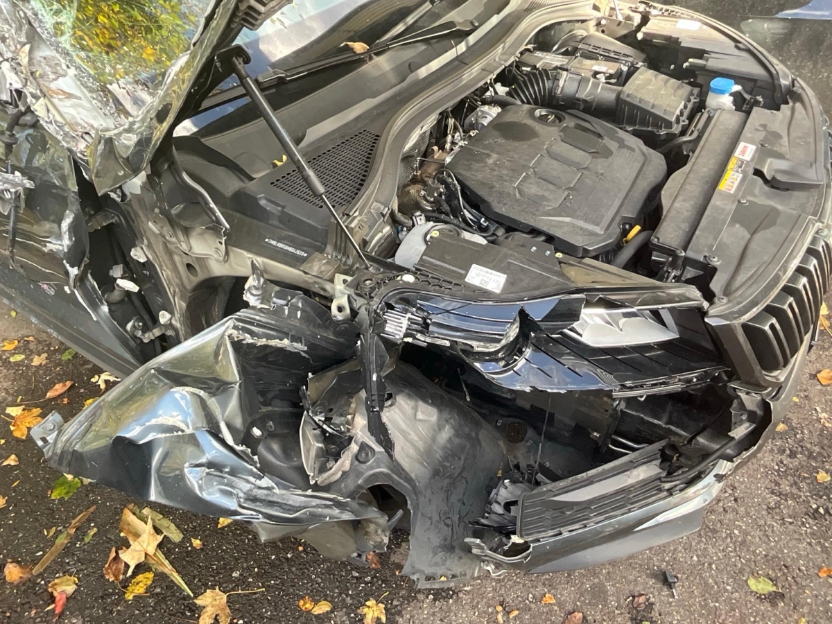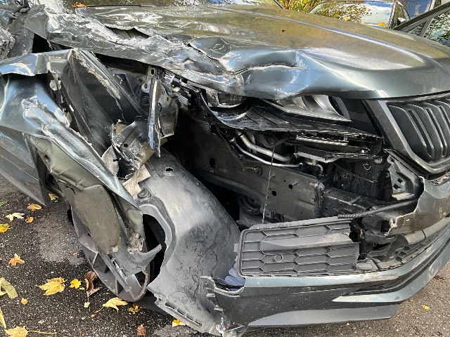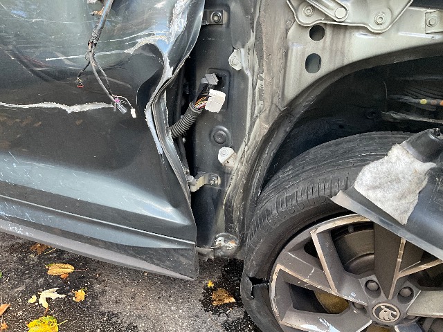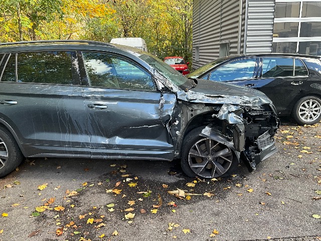 Beschreibung der Schäden: Seite re vorne eingedrückt, Kotflügel, Motorhaube Türe re, Dachrahmen eingedrückt, FS gebrochen, Raudaufhängung vr re deformiert