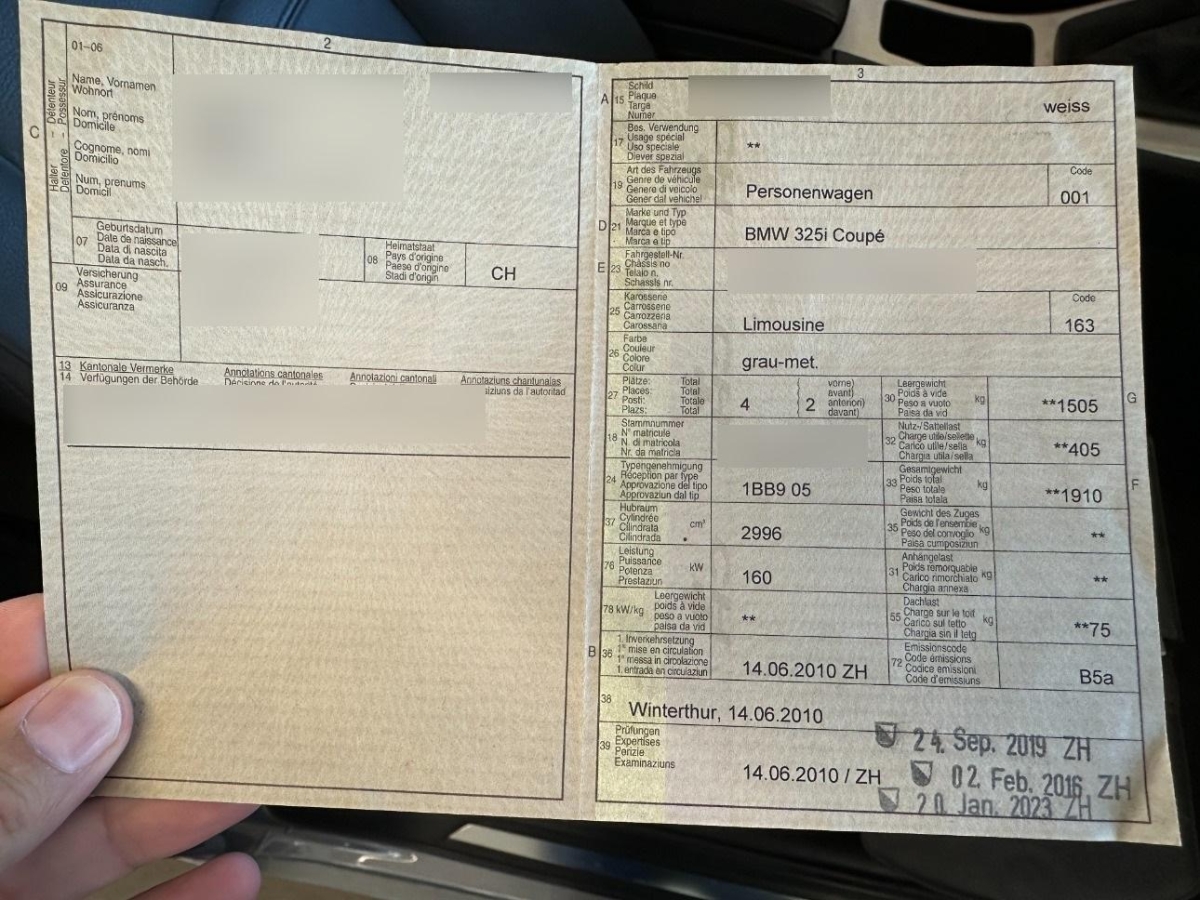 Zentralverriegelung mit Fernbedienung, Nichtraucherausführung, Elektrische Fensterheber vorne, Abschliessbare Radschrauben, Wegfahrsperre elektronisch, Xenon-Lichtanlage, Bremsassistent (BAS), Exterieurumfänge in Wagenfarbe, 6 Lautsprecher, Einstiegsschienen, Katalysator geregelt, Start-/Stop-Knopf, Dekor: Interieurleisten in Satinsilber matt, Radio BMW Business CD, Gurtbringer elektrisch vorne, Lenkrad: Multifunktionslenkrad, Aktive Kopfstützen, Nebelscheinwerfer, Klimatisierungsautomatik, Scheinwerfer-Waschanlage, Frontscheibe mit Color-Band, Dynamische Bremsleuchten, Window-Kopfairbags, Sitzbelegungserkennung für Beifahrersitz, Lenkrad: Lenkrad längs- und höhenverstellbar, Dynamische Stabilitätskontrolle (DSC), Check-Control-System, Mittelarmlehne hinten, Reifen mit Notlaufeigenschaft, Automatische Stabilitäts- und Traktions- kontrolle, Bremsbelag-Verschleissanzeige, Verbandskasten, Rücksitzlehne geteilt abklappbar, Vordersitze teilelektrisch (Höhen-, und Lehnenverstellung), Elektrische Lenkung (EPS), Anfahrassistent, Lenkung, elektrisch unterstützt, ISOFIX Kindersitzvorrichtung, Gurtstraffer vorne, Aussentemperaturanzeige, Veloursfussmatten vorne und hinten, Lackierung: Uni-Lackierung, Beide Make up-Spiegel beleuchtet, Bordcomputer, Antiblockiersystem (ABS), Leichtmetallfelgen Sternspeiche 339, 17J mit Pneu, Seitenairbags, Airbag: Airbag Fahrer und Beifahrer, Stoff-Ausstattung Diagonal, Assist: Crash-Sensor, Drittes Bremslicht, Chrom-Line Exterieur, Sport-Lederlenkrad, AUX-Anschluss, Getriebe: 6-Gang-Getriebe