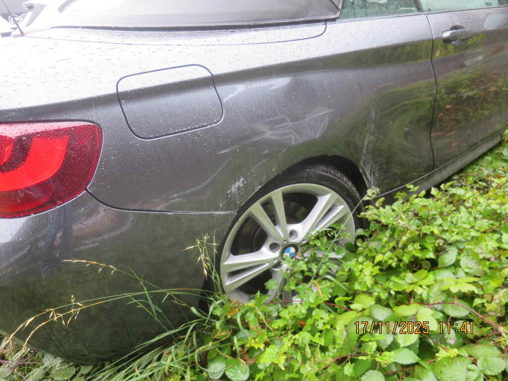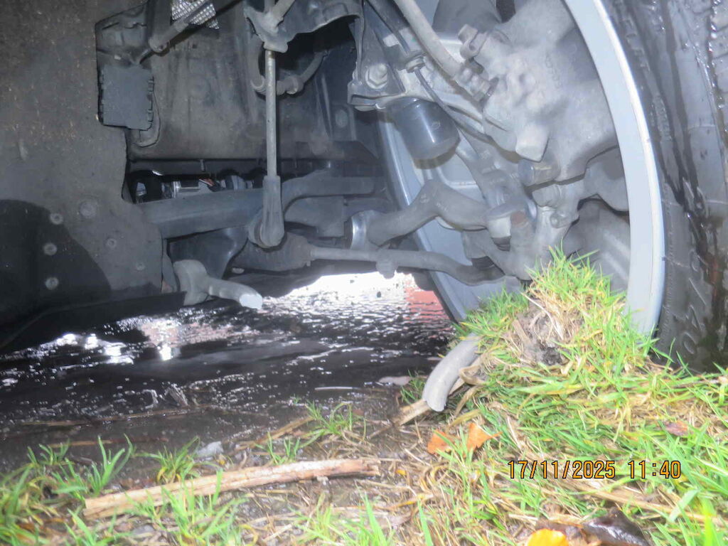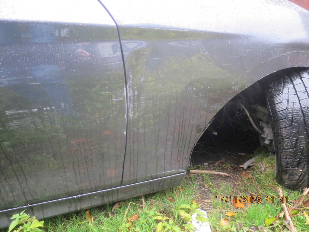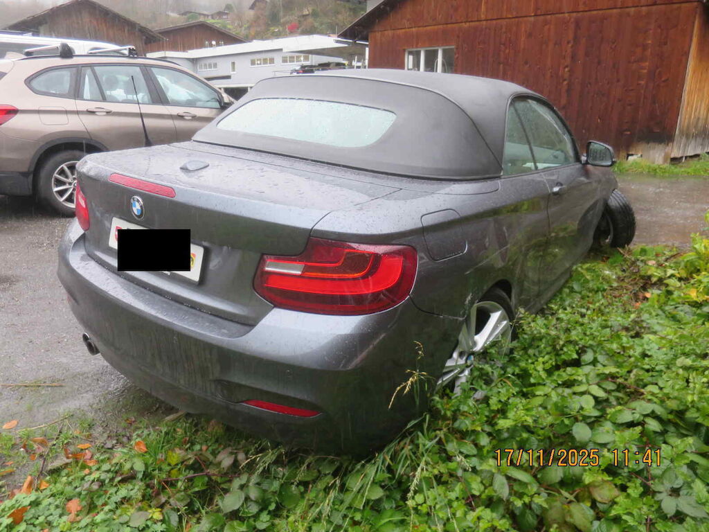 Sst vr gerissen, Scheinwerfer vr zerkratzt, Kotflügel vr deformiert, Rad und Radaufhängung vr beschädigt, Querlenker vr gebrochen, Türe vr beschädigt, Seitenwand hr stark deformiert, Radaufhängung hr beschädigt, nicht einsehrbar, Sst hr zerkratzt Motor Getriebe Vorderachse Hinterachse Airbags ausgelöst: 0 unbekannt ( Abfallcode 16.01.04ak )