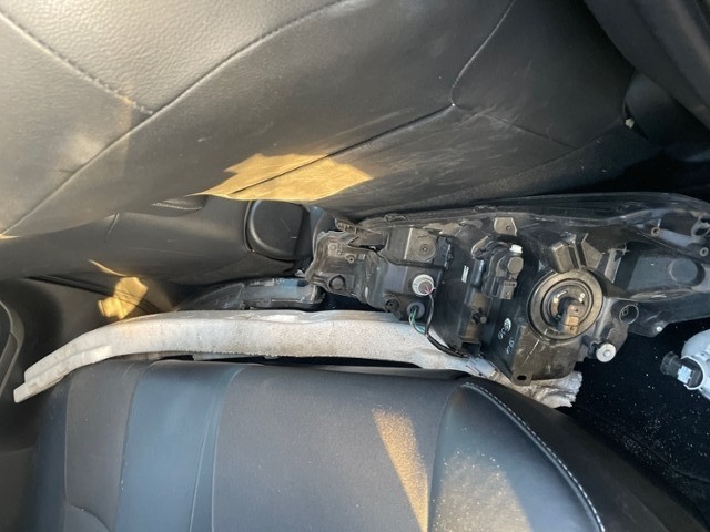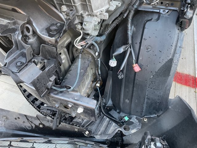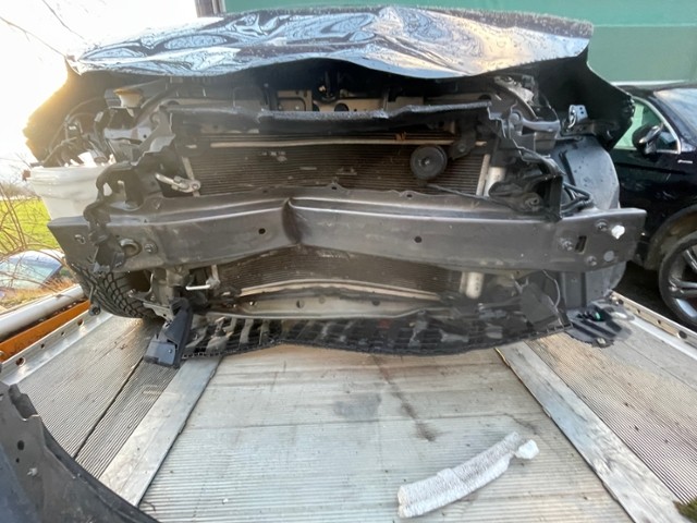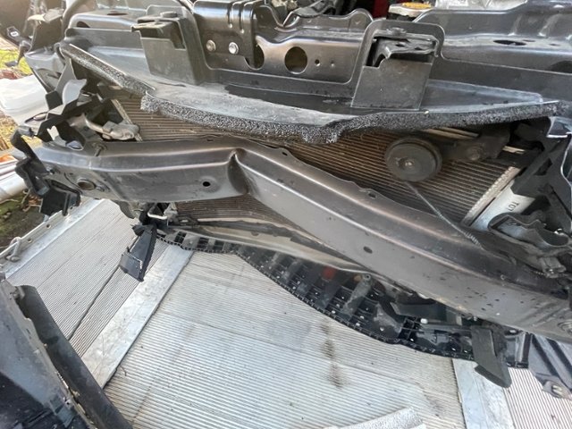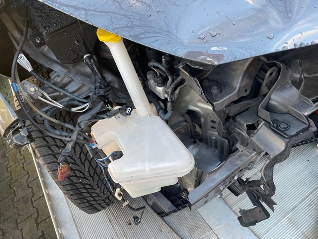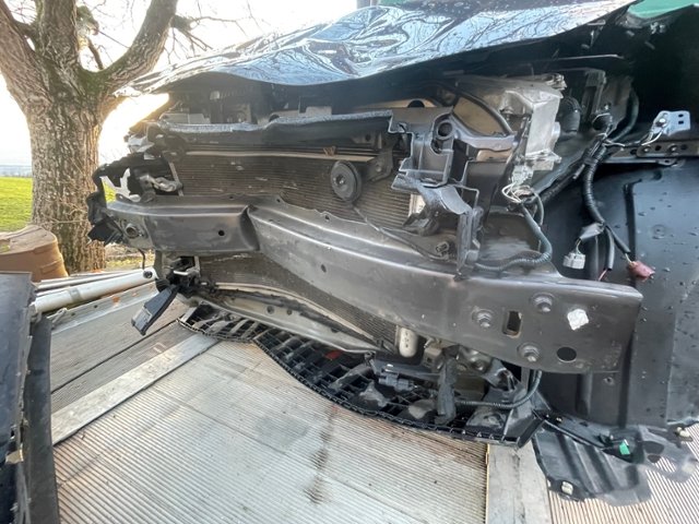 Front eingedrückt. Längsträger vorne rechts und links gestaucht. Fahrzeugvorbau verschoben.