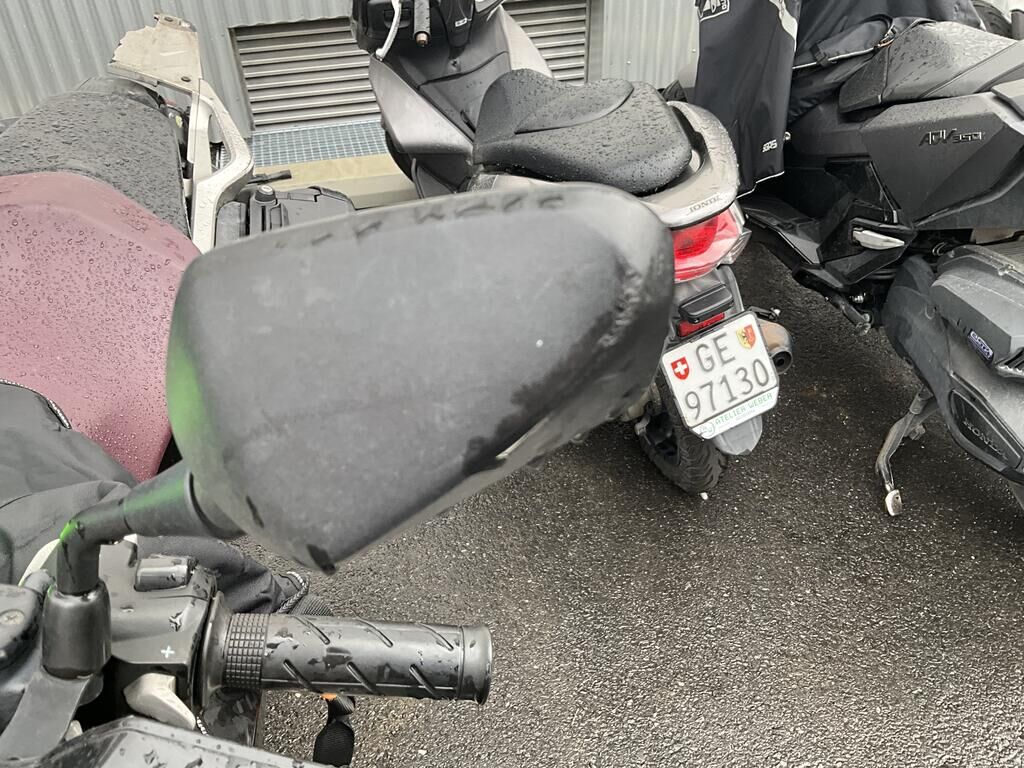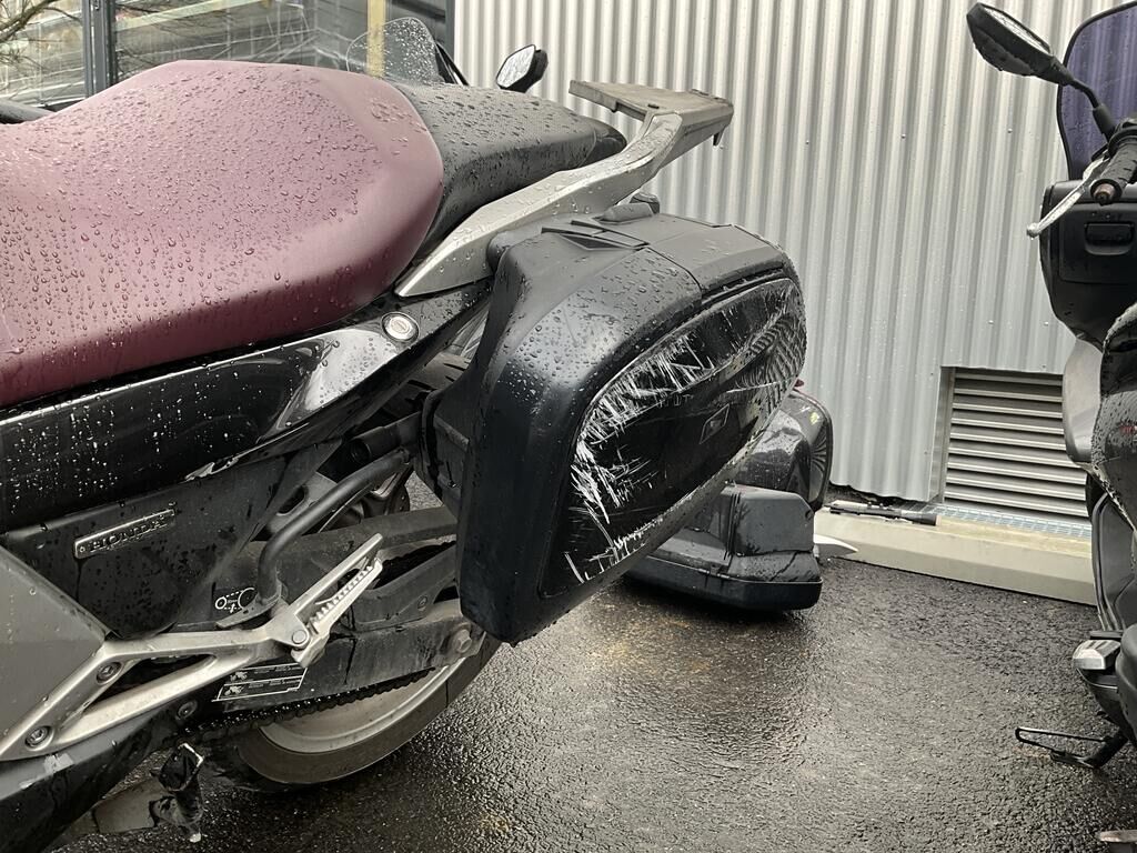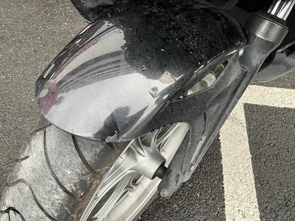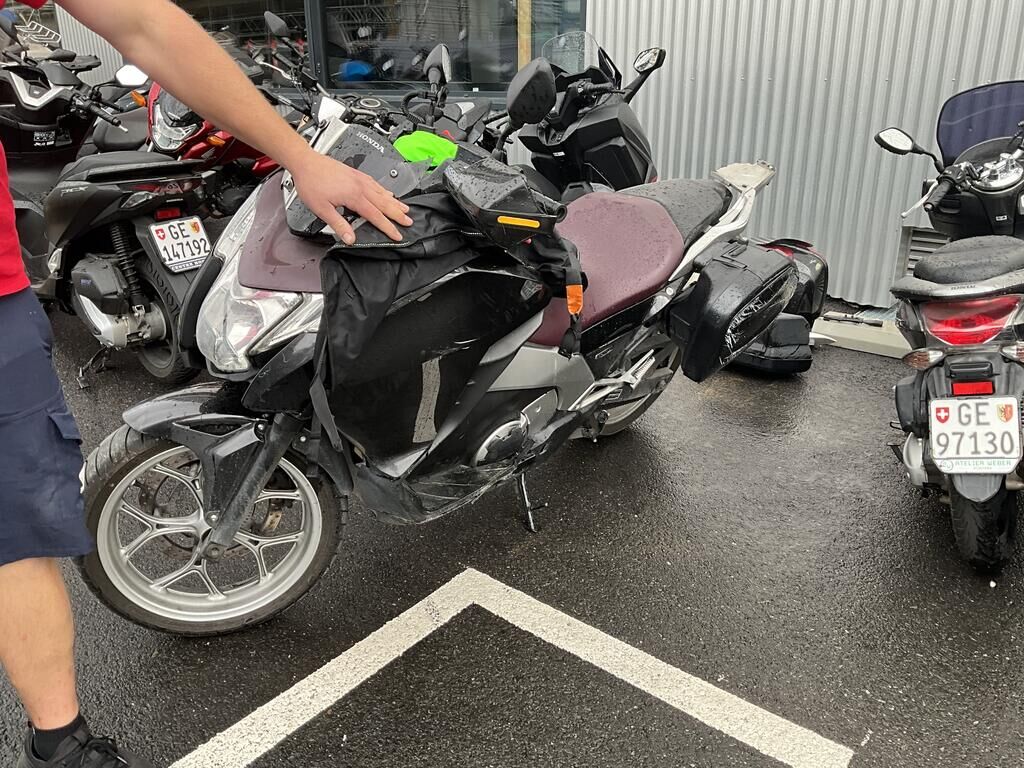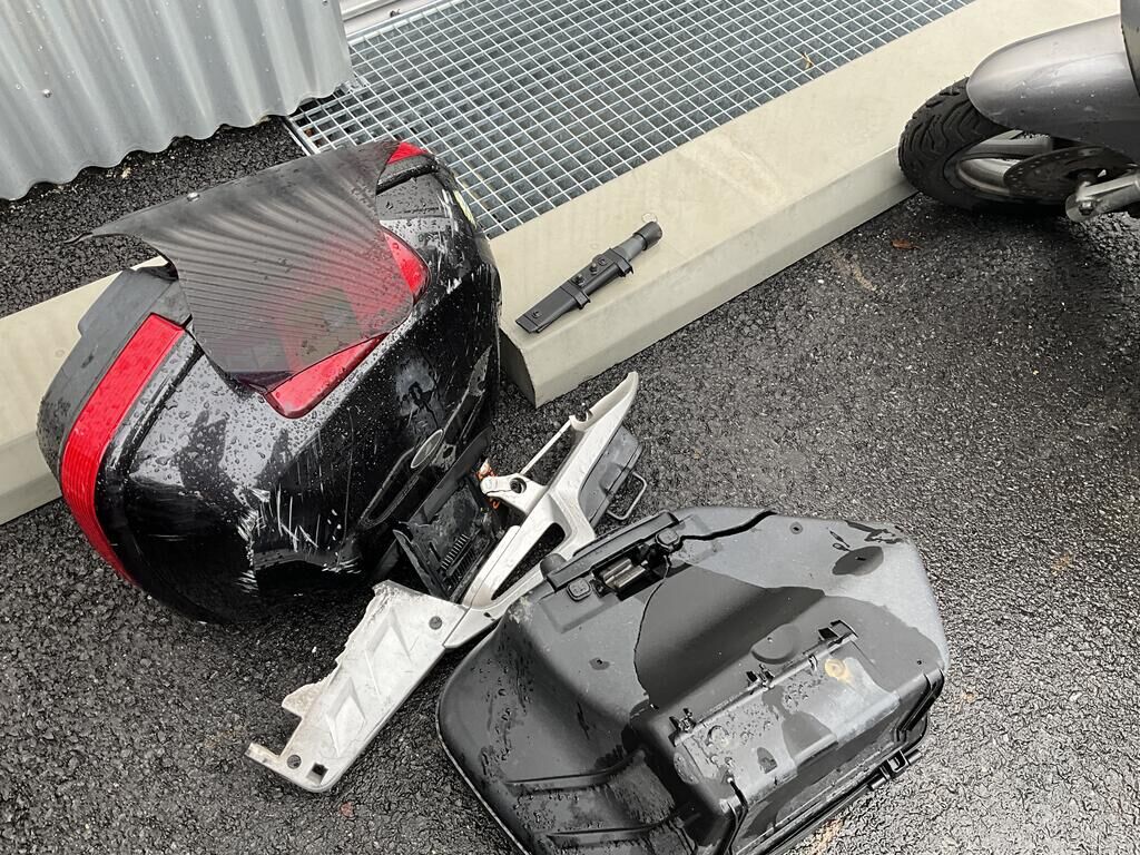 Top case, valises ARR, phare AV, pare-brise, support de carénage AV, carénages flanc GA, garde boue AV, rétroviseur GA, bavette ARR endommagés. Motor Getriebe Vorderachse Hinterachse Airbags ausgelöst: 0 unbekannt ( Abfallcode 16.01.04ak )