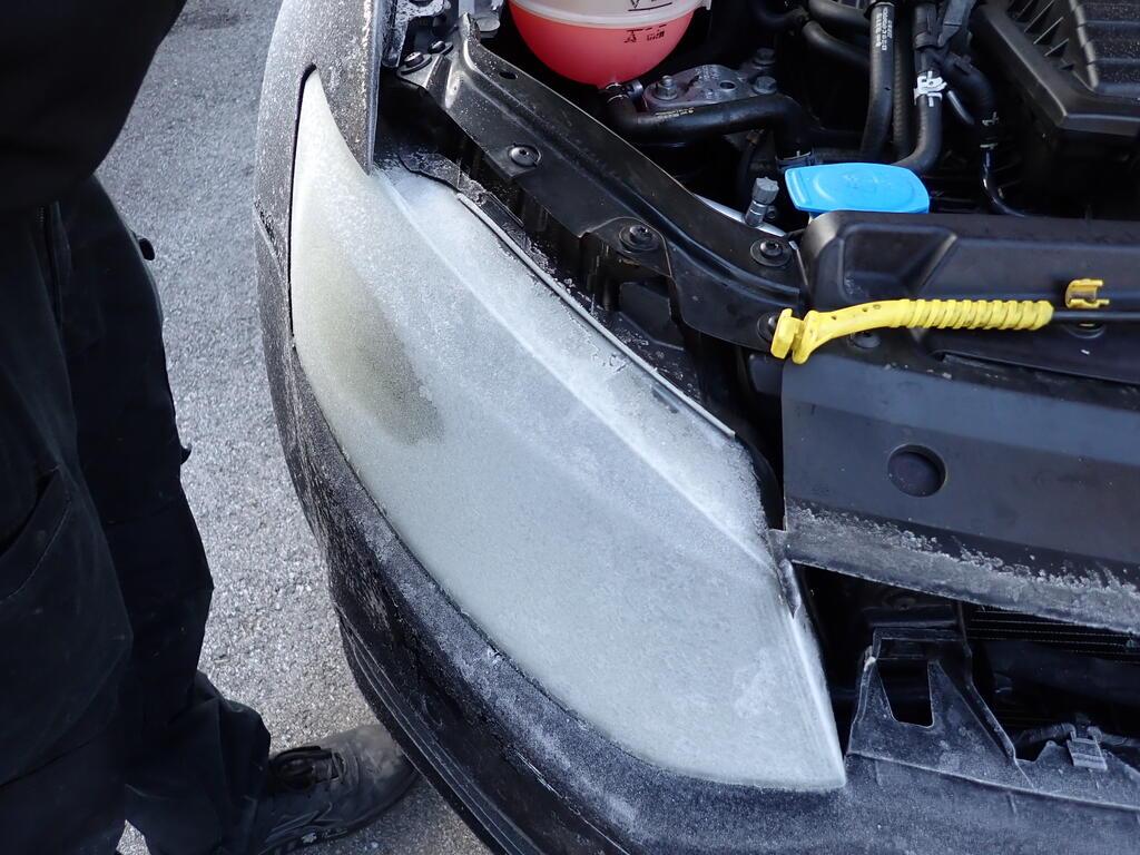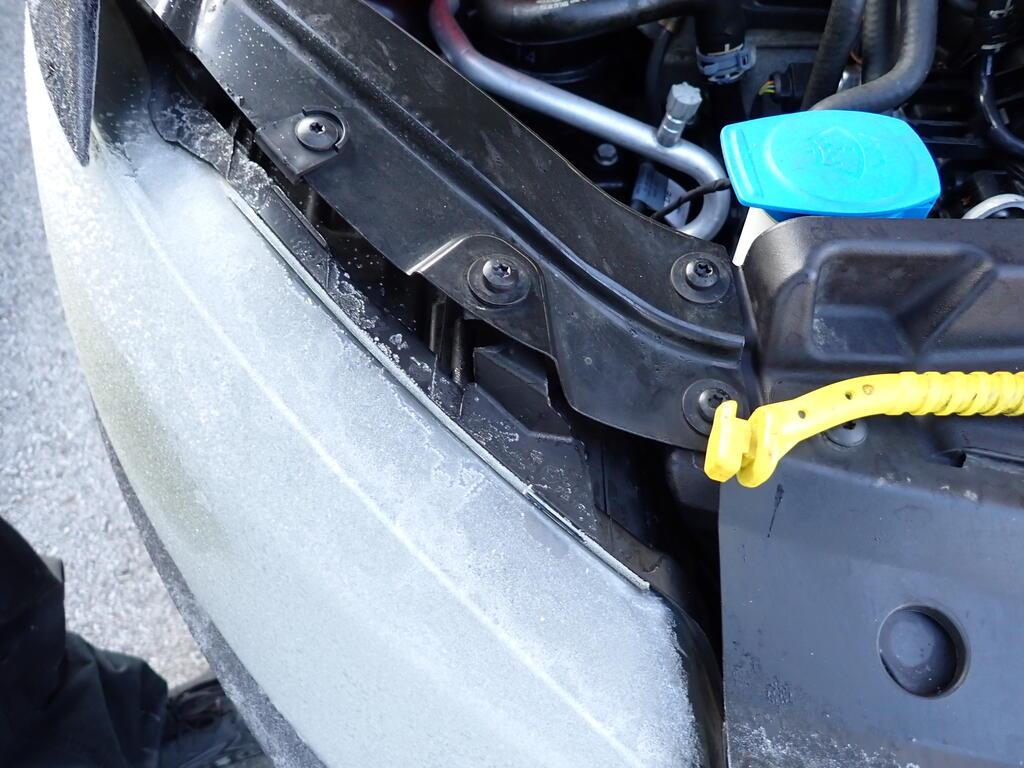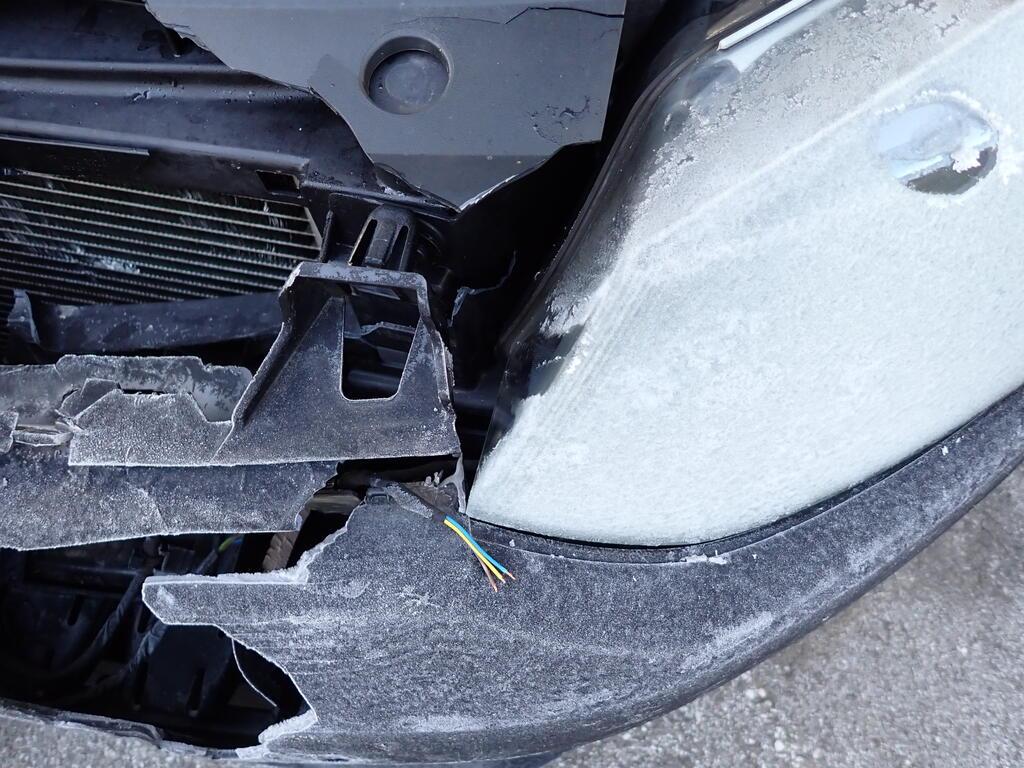 Choc avant : Capot moteur et renfort avant enfoncés et refoulés. Pare-chocs avant, porte serrure, phares avant, radiateurs et radar avant enfoncés et cassés. Partie avant endommagée. Tôle frontale enfoncée. Tous les radiateurs endommagés. Risques sur les boîtiers de commande et les feux antibrouillard. / Préexistant : traces d'utilisation