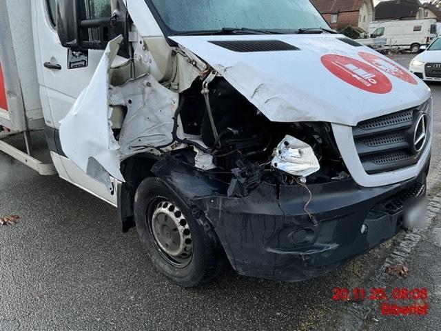 Front rechts: Stossfaenger, Motorhaube, Scheinwerfer rechts, Blende, Lüftungsgitter, Külergrill, Pralldämpfer, Prallträger, Schlossträger, Längsträger oben, Kotflügel, Radhausschale vorne, Türe vorne, Spiegel deformiert/zerkratzt/gerissen/gebrochen. AUFZÄHLUNG NICHT ABSCHLIESSEND / Vorbestandene Schäden: Zahlreiche Schäden am Aufbau (siehe Bilder), Motorlampe leuchtet