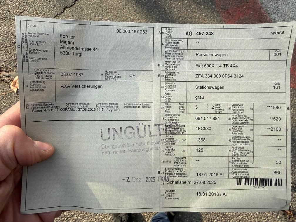 Fiat 500X Allrad, Automat mit adaptivem Tempomat, Spurassistent, Sitz- und Lenkradheizung, Navi, DAB+, Keyless uvm. Reifen wurden bei km 106000 erneuert, ebenfalls die Bremsen vorne und hinten Belege vorhanden) Fahrzeug fährt sich einwandfrei, Probefahrt durchgeführt (ca. 50km) Kann besichtigt werden vor Ort bei Terminvereinbarung. Für sichtbare oder nicht sichtbare Mängel wird am Ende der Auktion nicht gehaftet. Wir testen und prüfen nicht alle Funktionen am Fahrzeug. Das Risiko liegt somit vollumfänglich beim Käufer. Nach erhalt des Zuschlags, gibt es keine Nachverhandlung, auch wenn nicht deklarierte Mängel zum Vorschein kommen. Ab Platz ohne Garantie oder Gewährleistung, Wandelung und Minderung werden wegbedungen.