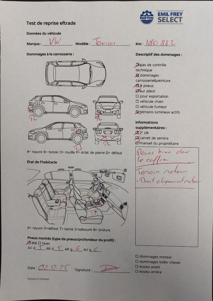 Pas de contrôle technique (essai en atelier) effectué Dommages divers à la carrosserie/à la peinture. Huit pneus. Les voyants d'avertissement s'allument pendant le fonctionnement - bruit/claquement moteur. Véhicule dès site, sans garantie et sans préparation. Motor Getriebe Vorderachse Hinterachse Airbags ausgelöst: 0 Nein ( Abfallcode 16.01.04ak )