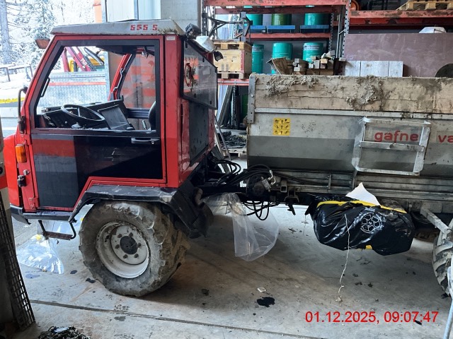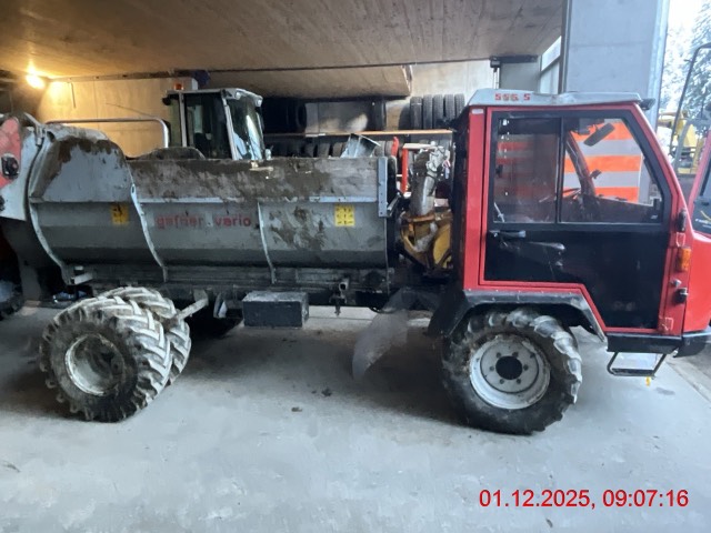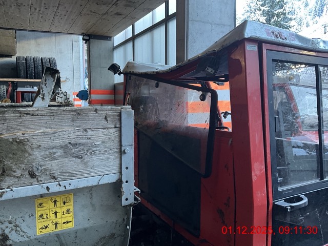 Komplette Kabine deformiert. Front-, Heck- und Seitenscheiben eingeschlagen. Motorölverlust unter ganzem Motorraum. Antriebswellen von Aufbau abgerissen. Kraftstofftank undicht. Seitenstreugerät komplett verzogen und beschädigt. Motor kann nicht gestartet werden. / Vorbestandene Schäden: Diverse Gebrauchsspuren - landwirtschaftliches Fahrzeug