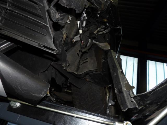 Front eingedrückt. Kotflügel vorne links eingedrückt. Motorhaube eingedrückt. Radhaus vorne links eingedrückt / gestaucht. Längsträger vorne links gestaucht. Fahrzeugvorbau nach rechts verschoben.