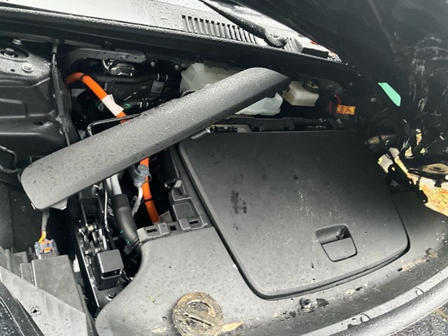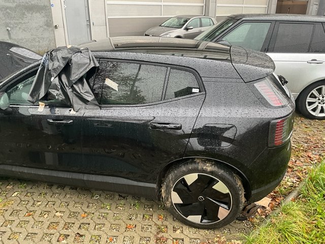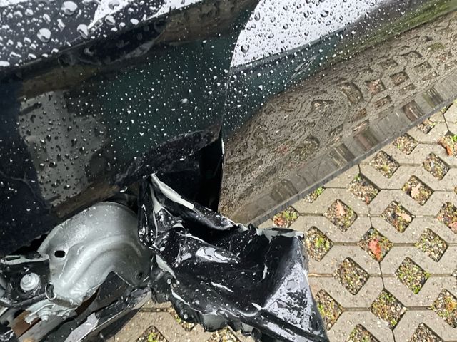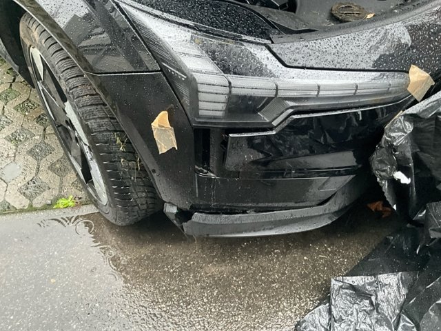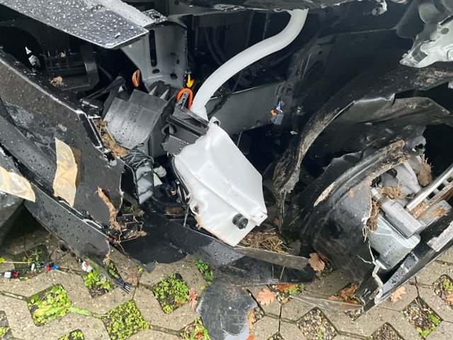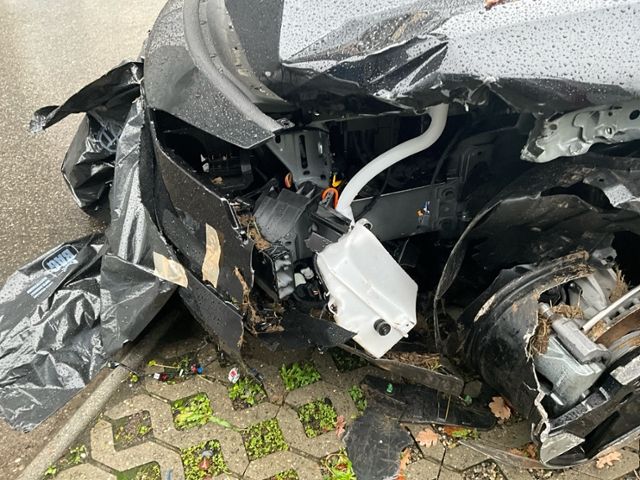 Front eingedrückt. Frontblech/Maskenblech eingedrückt. Radhaus vorne links eingedrückt / gestaucht. Längsträger vorne links gestaucht.