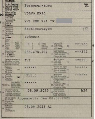 Airbag Fahrer und Beifahrerseite Elektrische Fensterheber vorne + hinten ABS Antiblockiersystem EDS Elektronische Differentialsperre Innen- und Fahreraussenspiegel automatisch abblendbar SIPS Kopf-/ Schulterairbag Sportlenkrad Vinyl/ Textilpolster Alarmanlage mit Neigungssensor Deaktivierung Beifahrerairbag Aussenspiegel elektrisch anklappbar Aussenspiegel mit Memoryfunktion Standheizung mit Timer Textilfussmatten 12 V Steckdose im Kofferraum Ambientebeleuchtung Vordersitze mit elektrischer Einstellung Zwei Zonen-Klimaautomatik Türsicherung hinten/ elektrisch Mittelarmlehne vorne mit Staufach Regen- und Lichtsensor Servolenkung geschwindigkeitsabhängig SIPS Seitenairbag Fahrer und Beifahrerseite Knieairbag Fahrer Isofix-Kindersitzbefestigung hinten BLIS Blind Spot Information System Panorama-Glasdach Leichtmetallräder 19" 5-Speichen Heckklappe elektrisch Berganfahr- Bergabfahrassistent Reifendruck-Sensoren TPMS Aussenspiegel beheizbar LED Tagfahrlicht Rücksitze umklappbar 60/40 Hifi Lautsprechersystem harman/kardon LED Rückleuchten Spurwechselassistent Details siehe gültige Preisliste des Importeurs Ladekabel Keine Gewähr auf die Angaben der Serienausstattungen Aktiver Spurhalteassistent LKAS Fussgänger-Soundmodul DAS Driver Alert/ Assistenzsystem Park Assist Pilot On-Board Lader 22 kw 360° Kamera Dach und Seitenspiegel in Kontrastfarbe Automatische Notbremsung Lendenwirbelstützen elektr. für Vordersitze Verkehrsschild-Erkennungssystem Apple Car Play Wireless Charging für mobile Geräte LED-Scheinwerfer mit Fernlichtassistent Dachhimmel Charcoal ESC Fahrdynamikregelung Querverkehrswarnassistent Adaptiver Tempomat ACC inkl. Stop & Go Funktion Spurwechselwarnung Wärmepumpe Garantie Batterie 8 Jahre/ 160'000 km Erweitertes Luftqualitätssystem 2 USB-C Anschlüsse Infotainmentsystem Android Einparkhilfe vorne und hinten / seitlich UWB Key VSP Volvo Swiss Premium