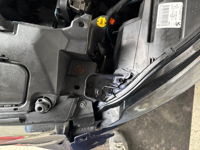 Front eingedrückt. Frontblech/Maskenblech eingedrückt. Radhaus vorne rechts eingedrückt / gestaucht. Längsträger vorne rechts und links gestaucht.