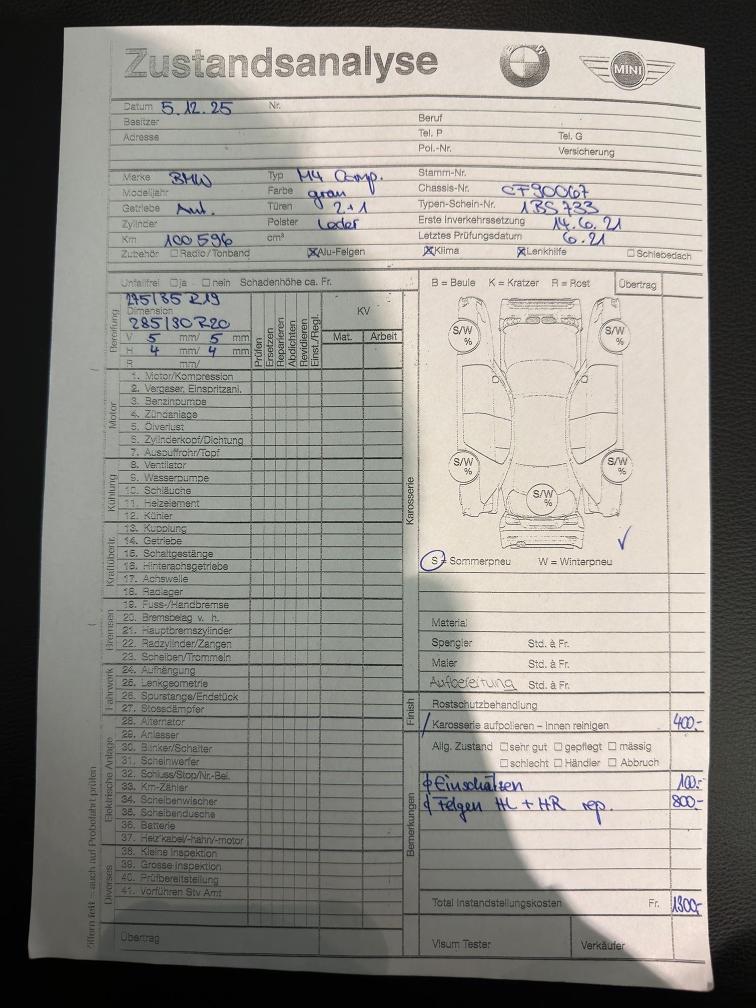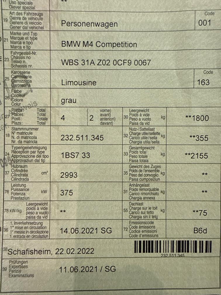 Fahrzeug in TOP Zustand, Frontscheibe Neu => hatte Steinschläge, Felgen HL und HR leicht beschädigt, sonst alles einwandfrei, polieren und Reinigung notwendig M 31AZ M4 Competition 119400.00 P 0C4P BROOKLYN GRAU METALLIC 1290.00 F LKIA LEDER MERINO/SILVERSTONE/SCHWARZ 440.00 S 01CB CO2 UMFANG 0.00 S 01DF ABGASTECHNIK EU6D/E 0.00 S 01MB M DRIVE PROFESSIONAL 0.00 S 01U0 19"/20" M SR.D.SP. 826 M SW. MB 0.00 S 0230 EU SPEZIFISCHE ZUSATZUMFAENGE 0.00 S 02NK M CARBON-KERAMIK-BREMSE 0.00 S 02PA RADSCHRAUBENSICHERUNG 0.00 S 02T4 M SPORTDIFFERENZIAL 0.00 S 02VB REIFENDRUCKANZEIGE 0.00 S 02VF ADAPTIVES M FAHRWERK 0.00 S 0302 ALARMANLAGE 0.00 S 0322 KOMFORTZUGANG 760.00 S 03MF M LEUCHTEN SHADOW LINE 380.00 S 0420 SONNENSCHUTZVERGLASUNG 550.00 S 0428 WARNDREIECK 0.00 S 0430 INNEN- UND AUSSENSPIEGELPAKET 0.00 S 0431 INNENSPIEGEL,AUTOMATISCH ABBLENDEND 0.00 S 0459 SITZVERSTELLUNG, ELEKTR.MIT MEMORY 0.00 S 048C M CARBON SCHALENSITZE 0.00 S 0493 ABLAGENPAKET 0.00 S 0494 SITZHEIZUNG FUER FAHRER/BEIFAHRER 0.00 S 04MC INTERIEURLEISTEN CARBON FIBRE 0.00 S 04NE BLOW-BY-HEIZER 0.00 S 04U0 GALVANIKAPPLIKATION FUER BEDIENELEM 130.00 S 0534 KLIMAAUTOMATIK 0.00 S 0548 KILOMETERTACHO 0.00 S 05AC FERNLICHTASSISTENT 0.00 S 05AL ACTIVE PROTECTION 440.00 S 05AU DRIVING ASSISTANT PROFESSIONAL 2540.00 S 05AV ACTIVE GUARD 0.00 S 05AZ BMW LASERLICHT 1900.00 S 05DA BEIFAHRERAIRBAG-DEAKTIVIERUNG 0.00 S 05DN PARKING ASSISTANT PLUS 1330.00 S 0610 HEAD-UP DISPLAY 0.00 S 0654 DAB TUNER 0.00 S 0688 HARMAN/KARDON SURROUND SOUND SYSTEM 700.00 S 06AE TELESERVICES 0.00 S 06AF GESETZLICHER NOTRUF 0.00 S 06AK CONNECTEDDRIVE SERVICES 0.00 S 06C4 CONNECTED PACKAGE PROFESSIONAL 0.00 S 06NW TELEFONIE MIT WIRELESS CHARGING 570.00 S 06U3 BMW LIVE COCKPIT PROFESSIONAL 0.00 S 06U8 BMW GESTIKSTEUERUNG 380.00 S 06WD WLAN HOTSPOT 0.00 S 071C M CARBON EXTERIEURPAKET 5960.00 S 0760 M HOCHGLANZ SHADOW LINE 0.00 S 0775 M DACHHIMMEL ANTHRAZIT 0.00 S 07CG REPAIR INCLUSIVE 3/200 0.00 S 07M9 M HOCHGLANZ SHADOW LINE ERW. UMF. 0.00 S 07ME M DRIVERS PACKAGE 0.00 S 07MM M RACE TRACK PAKET 20800.00 S 0851 SPRACHVERSION DEUTSCH 0.00 S 0879 DEUTSCH / BORDLITERATUR 0.00 S 08EK STEUERUNG KAROSSERIE 0.00 S 08KA OELWARTUNGSINT. 30.000KM/24MONATE 0.00 S 08R9 KAELTEMITTEL 0.00 S 08TF AKTIVER FUSSGAENGERSCHUTZ. 0.00 S 08TR DEKODIERUNG ZUSATZFUNKTIONEN 0.00 S 0997 HAENDLERPRAESENTATION 0.00 S 099A STEUERUNG KENNZEICHENBEFESTIGUNG II 0.00 S 09AA AUSSENHAUTSCHUTZ 0.00 Total Sonderausstattung 38170.00 Total Neupreis 157570.00