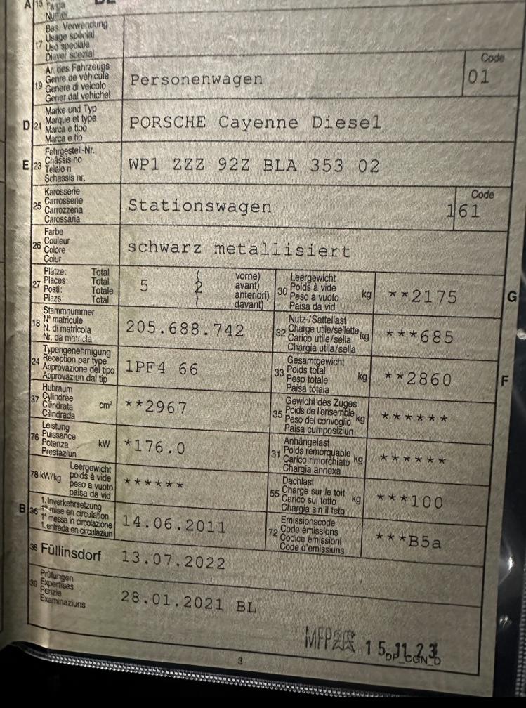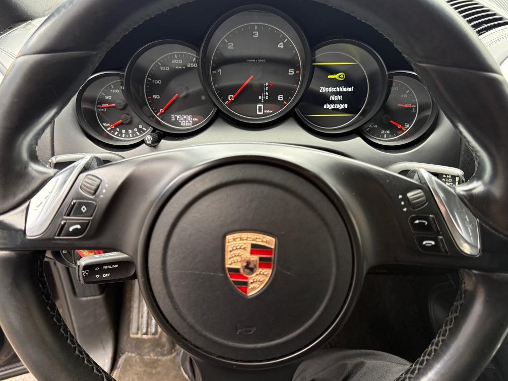 Am Fahrzeug wurden folgende Teile ersetzte: Die Bremsanlage wurde vorne und hinten komplett erneuert. Der Turbolader ist neu. Der Ansaugkrümer rechts und links sowie der AGR-Kuehler wurden ersetzt. Es wurde ein originaler Porsche-Turbo verbaut. Zusätzlich wurde zuerst ein Partikelfilter aus dem Zubehör nachgerüstet, jedoch ohne San-Marino-Zertifikat und ohne Regenrationserfolg daher wurde wieder der Originale Defekte Partikelfilter eingebaut. Diesen zubehör-Partikelfilter wird beim kauf mitgegeben. Vorglühanlage eingeschränkt leuchtet auch auf dem Tacho Der Unterdrucksensor ist ebenfalls neu. Ein Ölservice wurde durchgeführt. Das Fahrzeug hat zeitweise Leistungsverlust und eine Motorstörung, da die Regeneration nicht fachgerecht durchgeführt werden kann daher ist die Fahrt etwas eingeschränkt und empfohlen mit dem Anhänger ab zu holen. Die zentrale Verriegelung funktioniert, jedoch ist die Kofferraumklappe teilweise eingeschränkt der Mechanismus sowie die Zertralelektrik fällt sporadisch aus und leuchtet auf dem Tacho. Auch das Türelement hinten rechts ist betroffen. Innenraum siehe Fotos Am Fahrzeug wurde kein Werkstattest gemacht, weitere Mängel sind nicht ausgeschlossen. Der Kauf erfolgt auf eigenes Risiko. Eine Besichtigung sowie Probefahrt ist nach Rücksprache jederzeit möglich. Nachverhandlungen nach Auktionsende werden nicht akzeptiert. Am ganzen Fahrzeug Dellen, Kratzer und Schönheitsfehler anzutreffen. Bitte Bilder GENAU besichtigen. Auf allen Detail-Fotos sieht man Kratzer rund um das Fahrzeug. Stossstange vorne Risse im Lack hinten Kratzer
