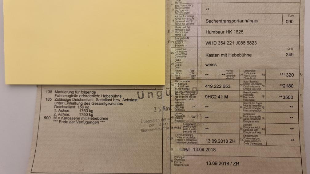 Humbaur, HK 1625 Anhänger gemäss Fotos Transportanhänger mit Hebebühne... Leergewicht: 1320kg Nutz-/Sattellast: 2180kg Wenig gebraucht....