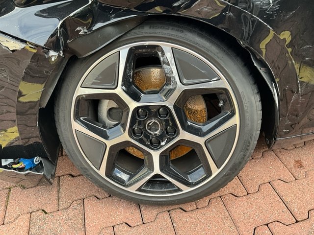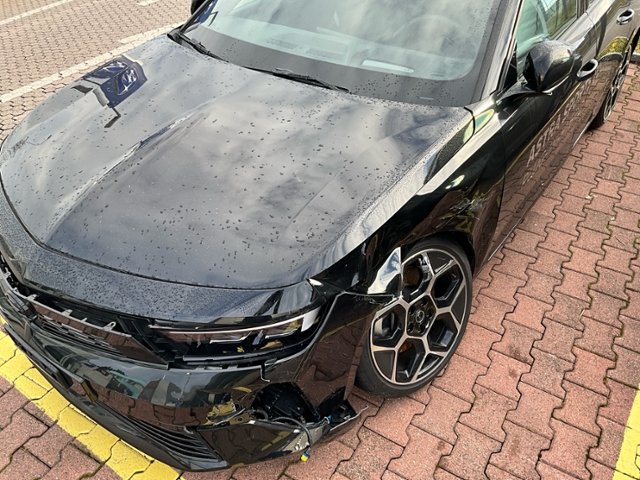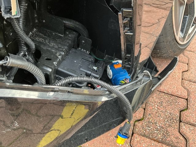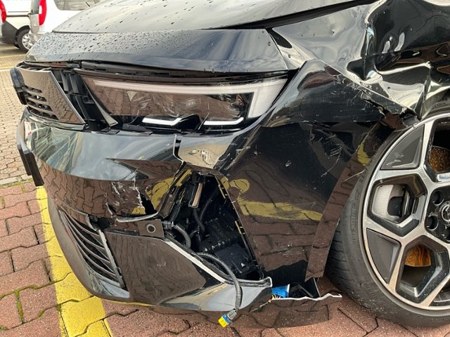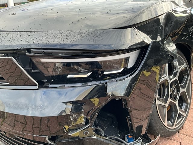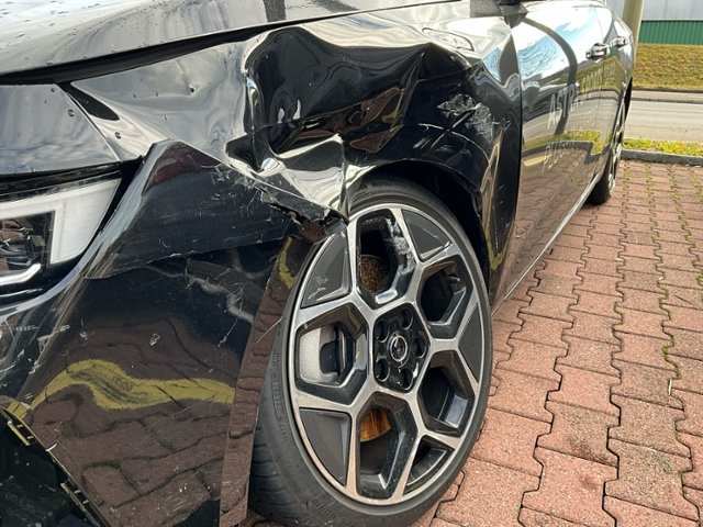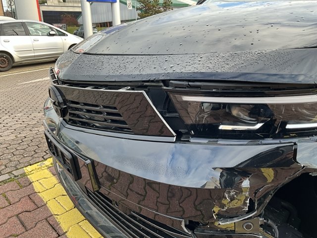 Front links eingedrückt. Radhaus vorne links eingedrückt / gestaucht. Fahrzeugvorbau nach rechts verschoben.