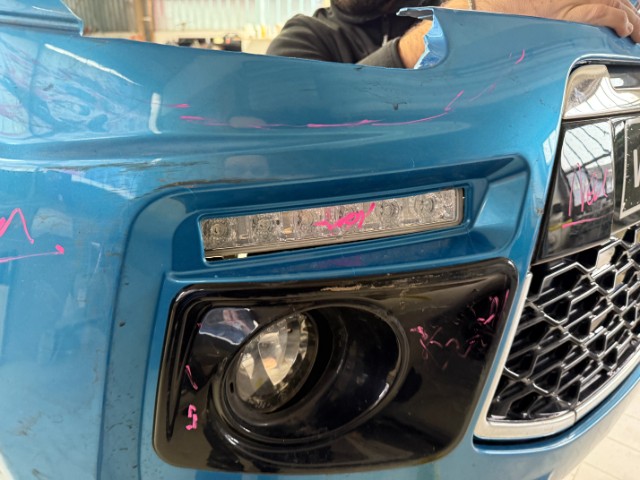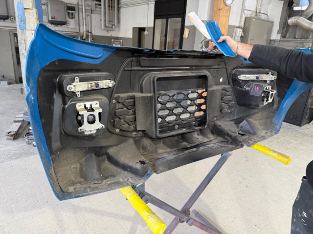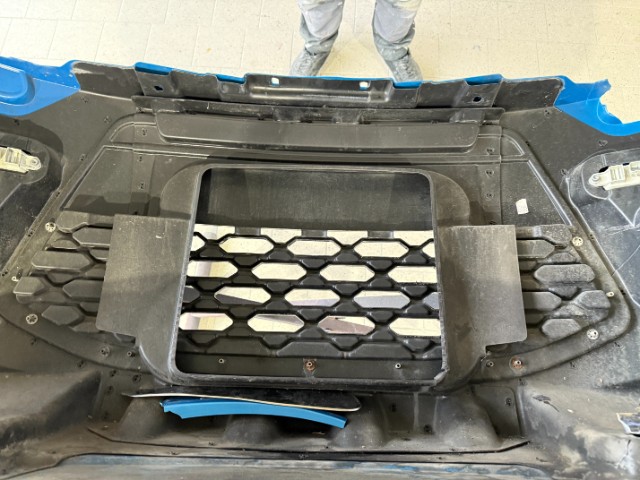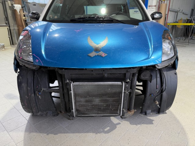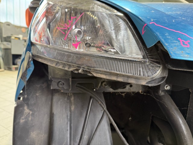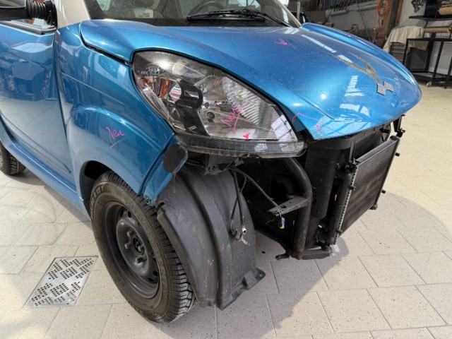 Front rechts eingedrückt. Frontblech/Maskenblech eingedrückt. Radhaus vorne rechts eingedrückt / gestaucht. Fahrzeugvorbau verschoben.