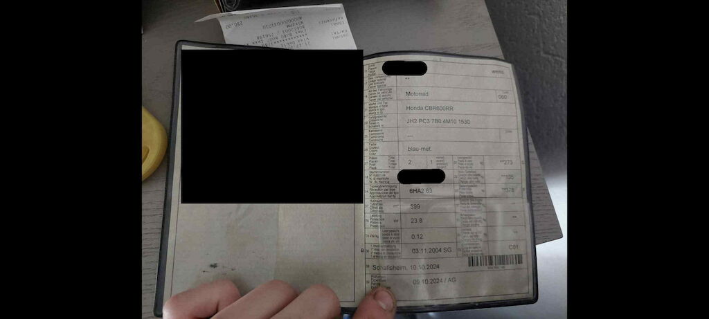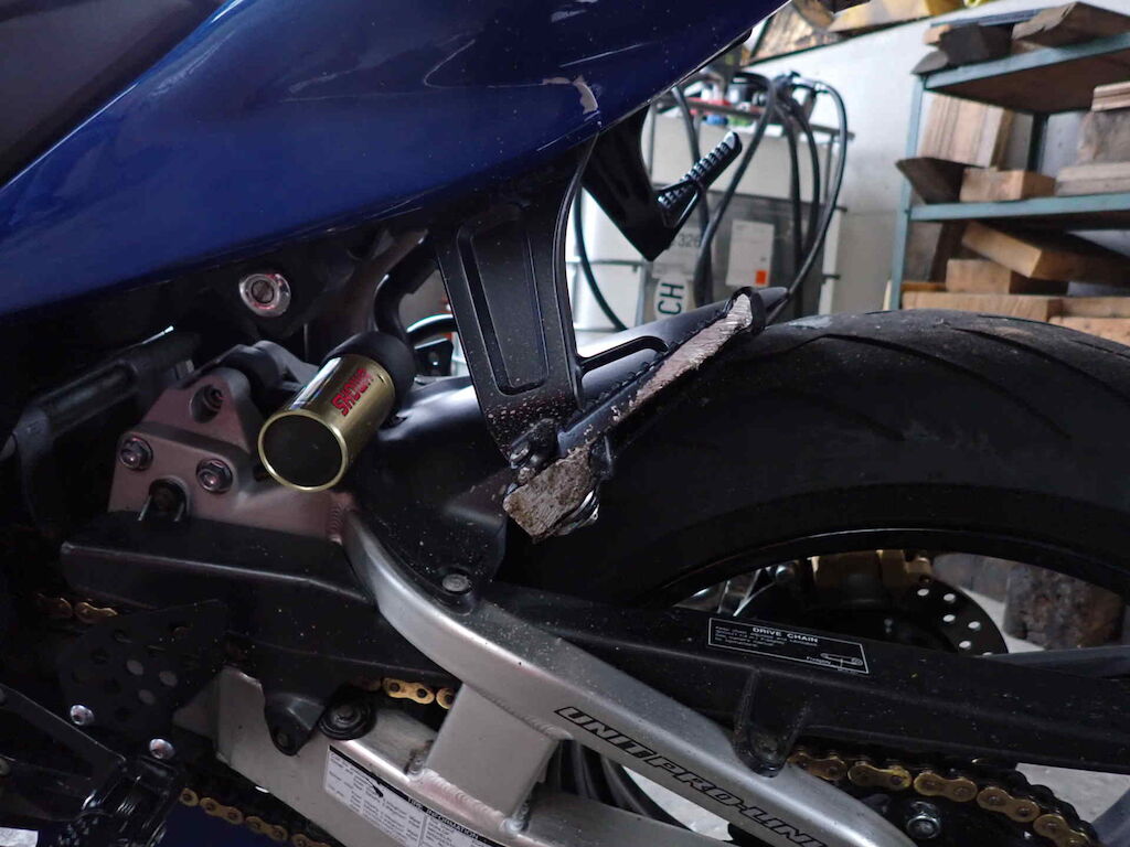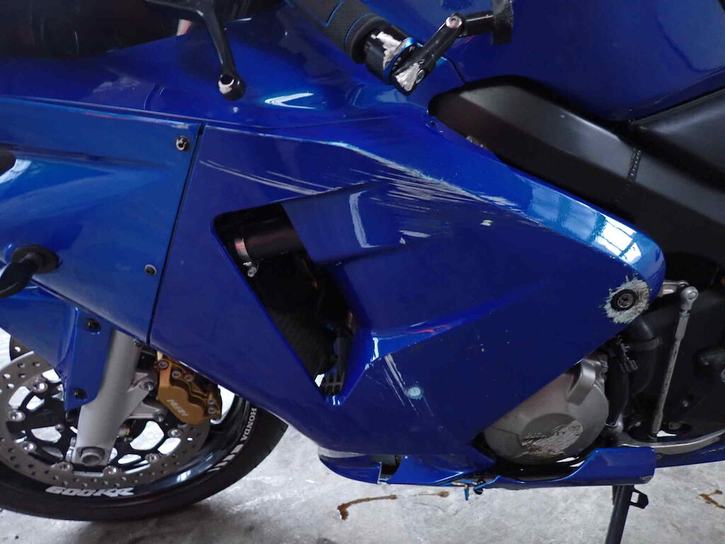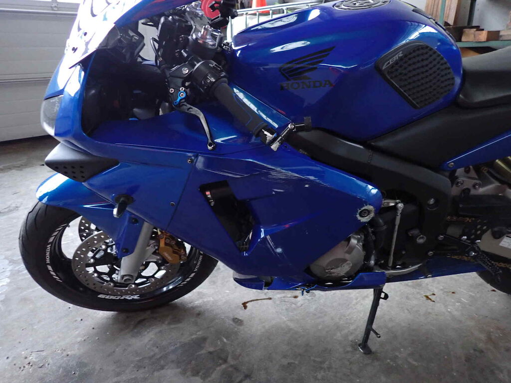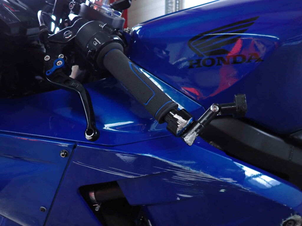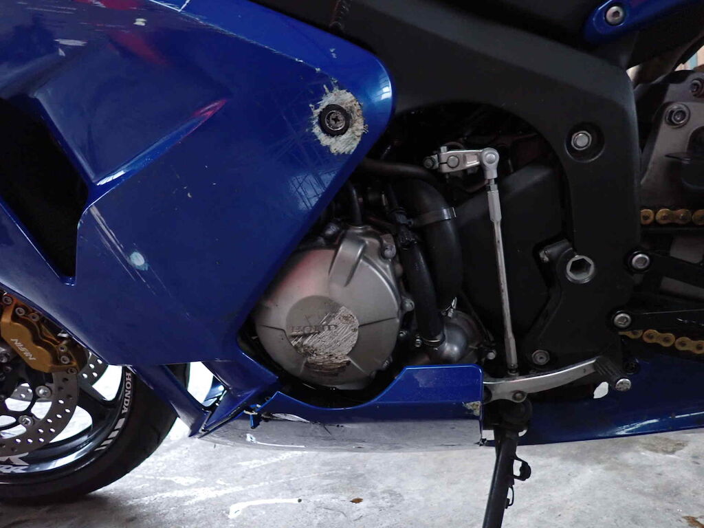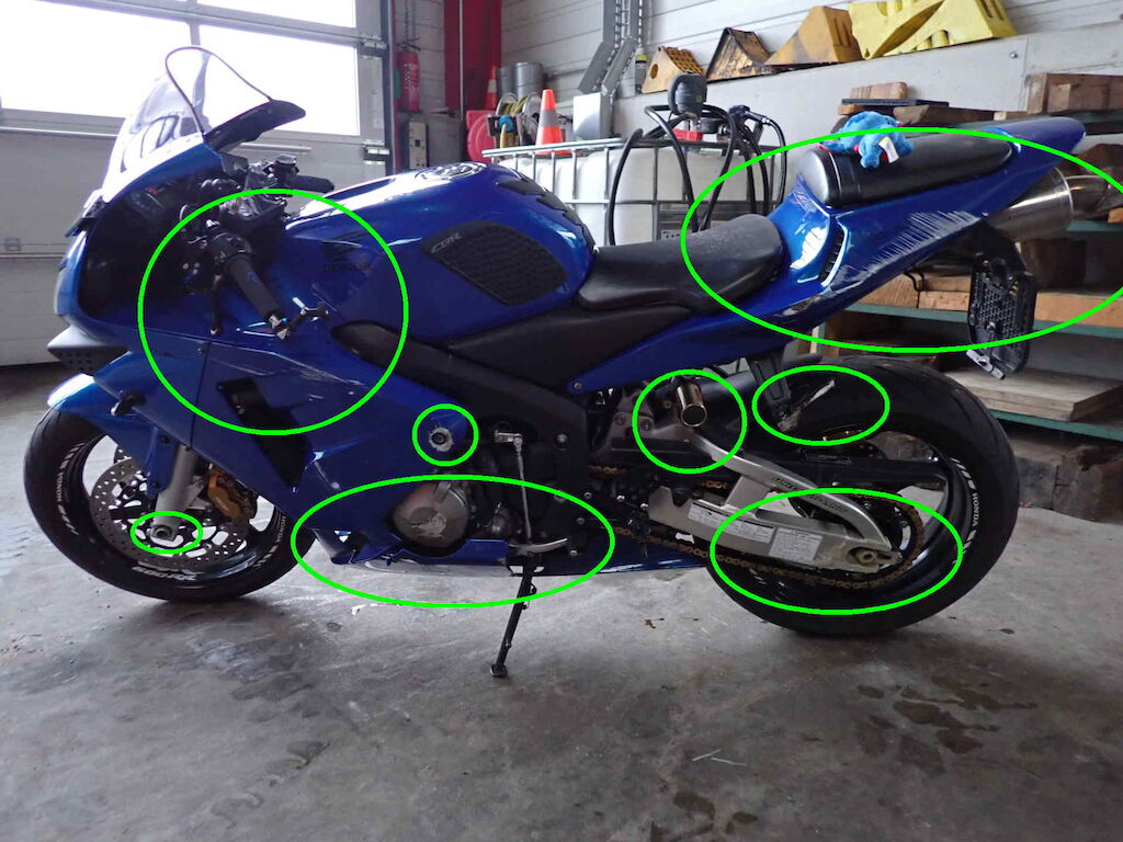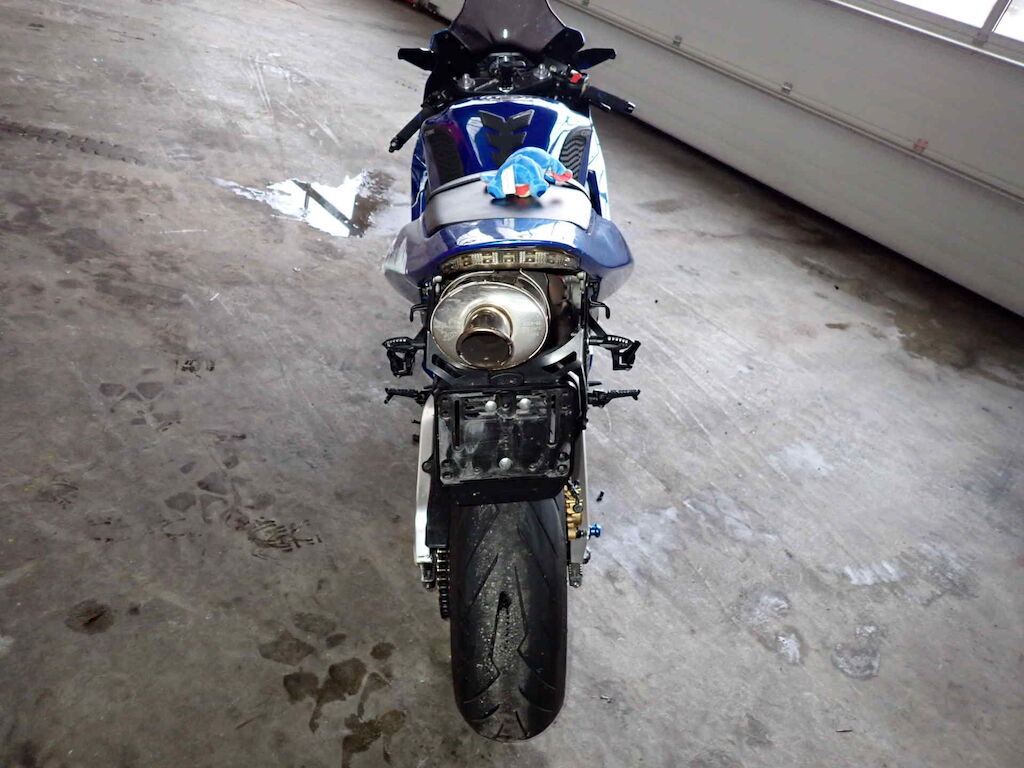 Ganze linke Seite, Lenker schief, Heck schief, Lenker, Griff, Kupplungshebel, Spiegel, Seitenverschalungen, Kupplungsdeckel, Heckverkleidung, Fussraster, Schwinge, Bremstritt, Achszapfen vorne Motor Getriebe Vorderachse Hinterachse Airbags ausgelöst: 0 unbekannt ( Abfallcode 16.01.04ak )
