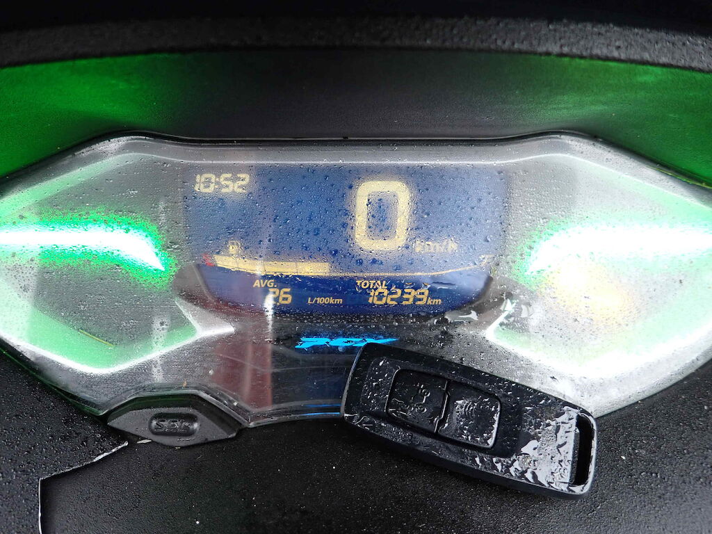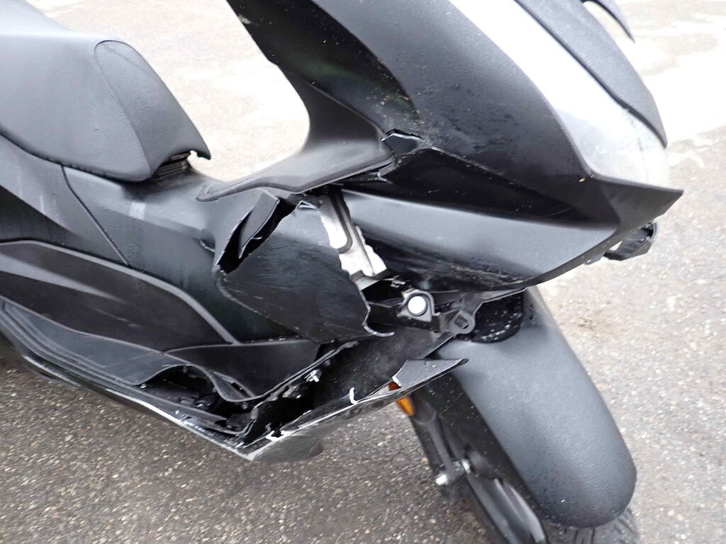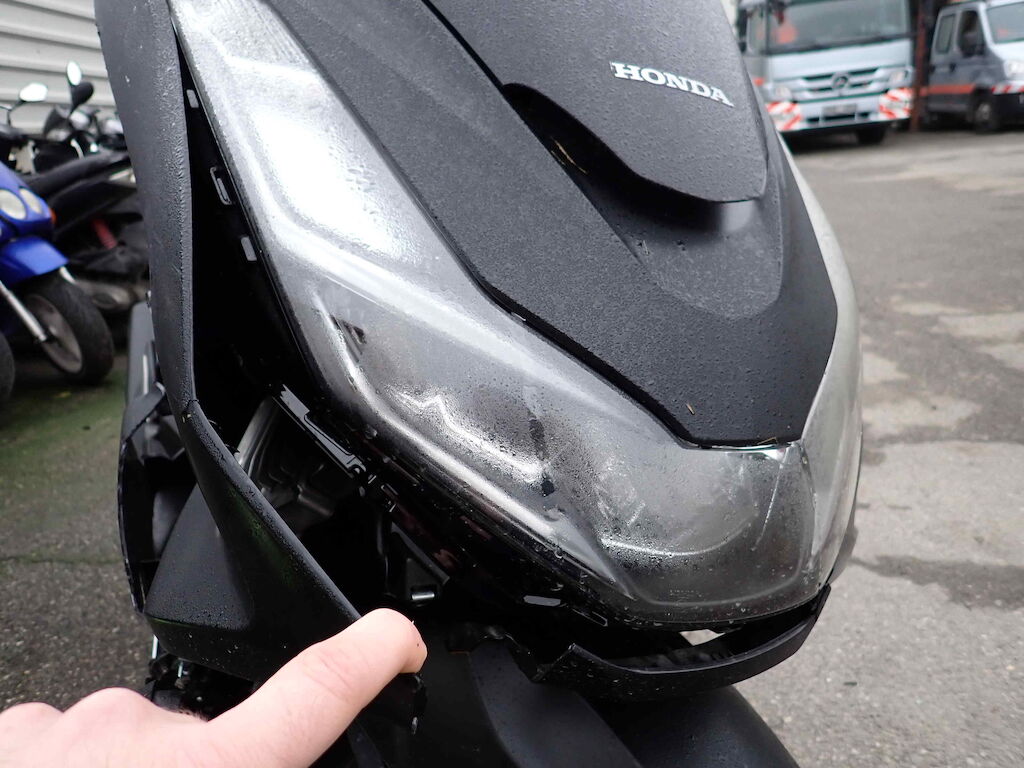 Choc avant droit + chute sur flanc droit: garde-boue avant, carénages, phare, rétroviseur, embout de guidon, guidon, levier de frein, boitier de fourche, plancher, repose-pied, protection et pot déchappement. Motor Getriebe Vorderachse Hinterachse Airbags ausgelöst: 0 unbekannt ( Abfallcode 16.01.04ak )