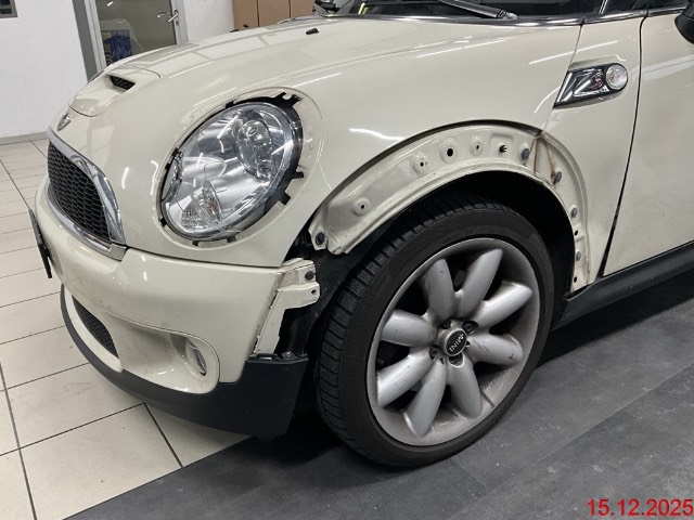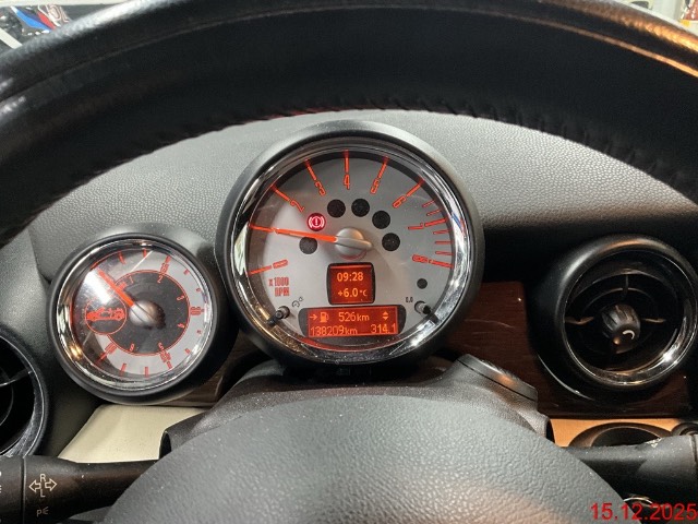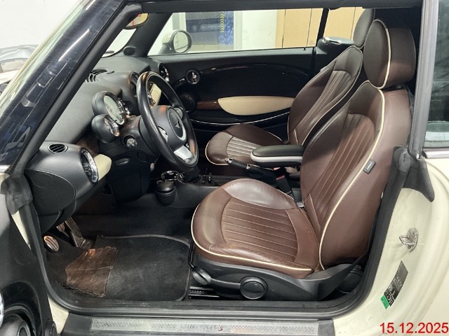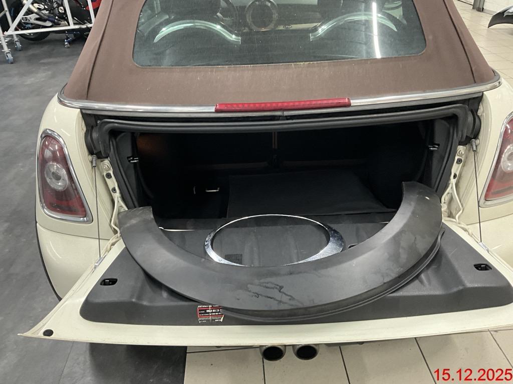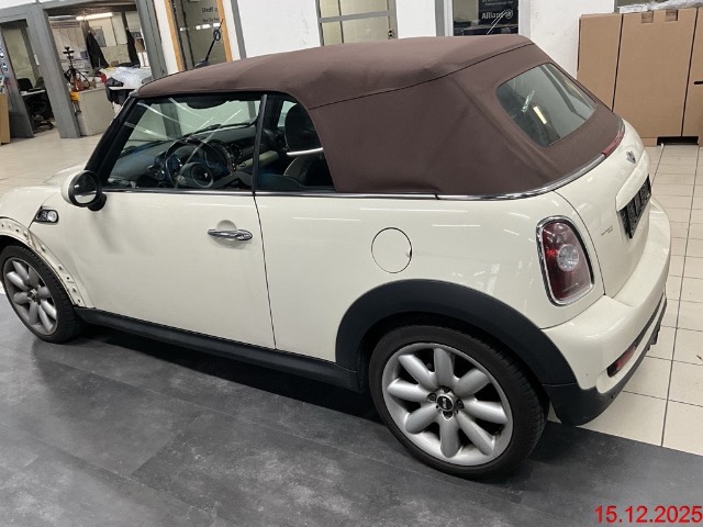 Verchromtes Auspuffendrohr, Getriebe: 6-Gang-Getriebe, Pollenfilter (Staubfilter), Wassertemperaturanzeige, Heckscheibenheizung, Reifenreparatur-Set (Tire Fit), Vollautomatisches Verdeck, Bremsassistent (BAS), Dynamische Stabilitätskontrolle (DSC), Licht: Halogenscheinwerfer, Leichtmetallräder S-Winder, 16J, Türgriffe aussen verchromt, Lackierung: Uni-Lackierung, Radio MINI CD, Auto Start-/Stop-Anlage, Lederlenkrad, Cupholder, Lichtwarnsummer, Antiblockiersystem (ABS), Mittelkonsole, Sitze: Rücksitzlehne geteilt abklappbar, Cornering Brake Control (CBC), Sonnenblende Fahrer und Beifahrerseite mit beleuchtetem Spiegel, Überrollschutzsystem, Wegfahrsperre elektronisch, Aussenspiegel in Wagenfarbe, Licht: Nebelschlussleuchte, Wartungsintervall-Anzeige, Verdeck schwarz, Zentralverriegelung mit Fernbedienung, Bremsbelag-Verschleissanzeige, ISOFIX Kindersitzvorrichtung, 3-Punkt-Sicherheitsgurte auf allen Plätzen, Seitenairbags, Drittes Bremslicht, Elektrische Fensterheber vorne + hinten mit Komfortschliessung, Lenkrad: Servolenkung, Airbag: Airbag Fahrer und Beifahrer, Drehzahlmesser, Erweiterte Dekorumfänge, Fahrersitz höhenverstellbar, Abschliessbares Handschuhfach, Park Distance Control (PDC), Abschliessbare Radschrauben, Licht: Tagfahrlicht, Kopfstützen hinten, Scheibenwischer vorne mit Intervall, AUX-Anschluss, Lenkrad höhenverstellbar, Tageskilometerzähler, Katalysator geregelt, Innenspiegel abblendbar, Leseleuchten vorne, Leuchtweitenregulierung von innen, Höhenverstellbare Gurten vorne, Automatische Stabilitäts- und Traktions- kontrolle, Polster: Stoff-Ausstattung, Licht: Abblendlichtausschaltverzögerung 'Follow me home'