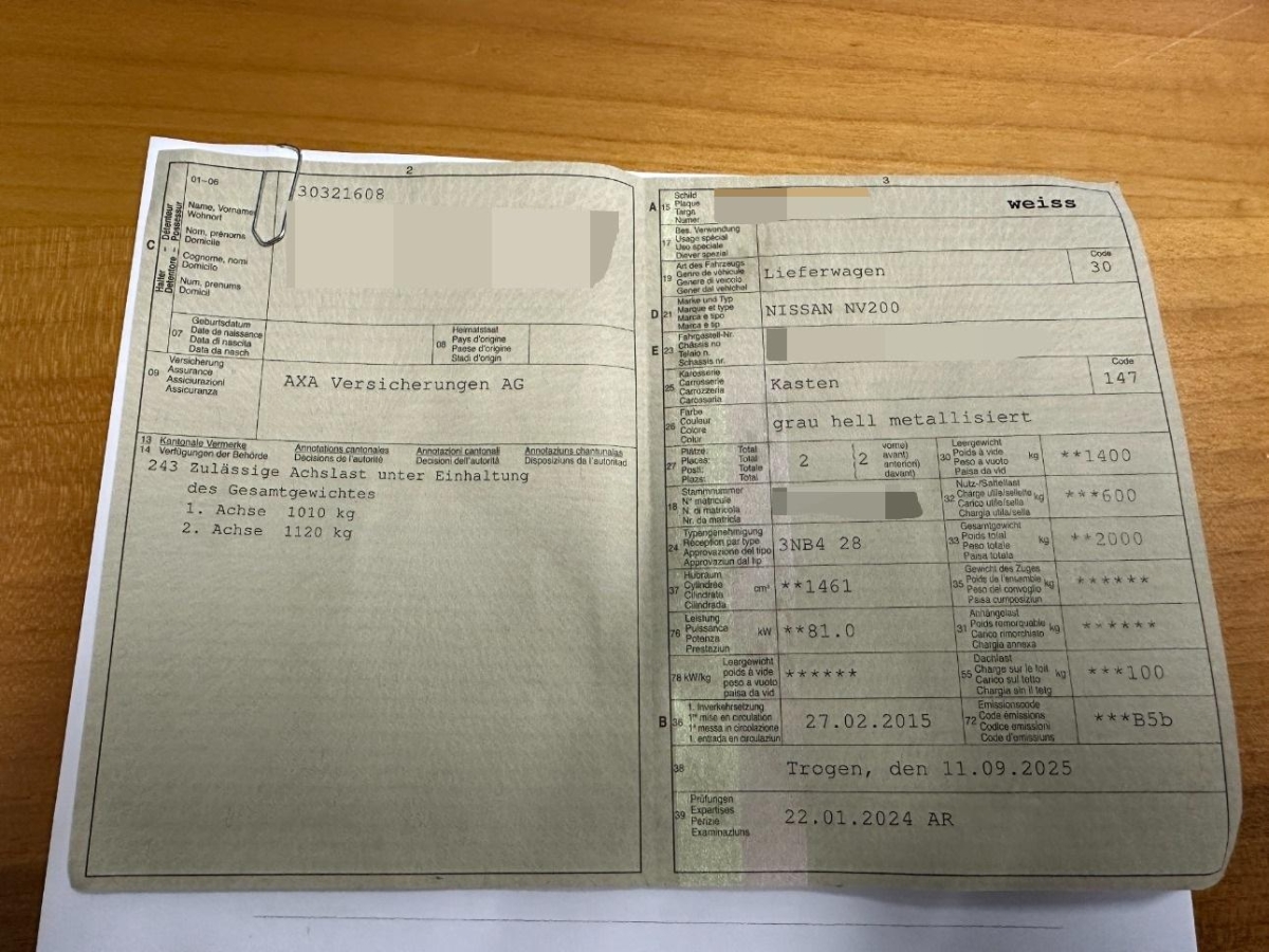 Schublade unter Fahrersitz, Lackierung: Uni-Lackierung, Feste Fenster in Schiebetüren, Zentralverriegelung mit Fernbedienung, Lichtwarnsummer, Aussenspiegel rechts und links elektrisch verstellbar, Radiovorbereitung, Antenne, Entstörung und 2 LS, Beifahrersitz-Rückenlehne umklappbar, Vollwertiges Ersatzrad, unter dem Fahr- zeug montiert, 5-Gang-Getriebe, Servolenkung, Assist: Tempomat mit Geschwindigkeitsbegrenzer, Bremsassistent (BAS), Teilverglasung Laderaum: feststehende Fenster seitlich auf der Höhe der Schiebetür(en), Airbag: Airbag Fahrer und Beifahrer, Fahrer-Assistenz-Paket: Rückfahrkamera, Nebelscheinwerfer, Licht und Regensensor, Stoff-Ausstattung, Bordcomputer, Lenkrad höhenverstellbar, Radio/CD-Player mit Bluetooth®, Scheibenwischer vorne mit Intervall, Seitenairbags, Befestigungsösen im Laderaum, Partikelfilter und Oxydationskatalysator, Türen: Schiebetüre rechts, Bestuhlung Fahrgastraum 3er-Sitzbank 2. Sitzreihe, Elektronisches Stabilitäts-Programm (ESP), Türen: Schiebetüre links, Heck-Verglasungspaket:Hecktüren mit 180° Öffnungswinkel, Heckverglasung inkl. Heckscheibenwischer und -heizung, Trennwand mit Fenster, Innenspiegel abblendbar, Antiblockiersystem (ABS), Wegfahrsperre elektronisch, Gurtstraffer vorne, Laderaumboden mit Kunststoffbelag, Drehzahlmesser, Elektrische Fensterheber vorne, Klimaanlage