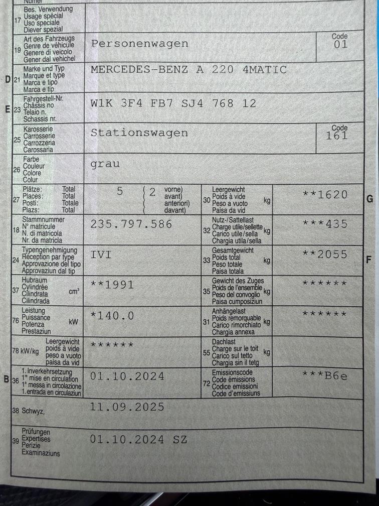 X PSN Paket: AMG Line Premium 9’000.00 X L6J Lenkrad: AMG Performance Lenkrad in Leder Nappa X 581 Klima: Klimatisierungsautomatik THERMOTRONIC X 950 Paket: AMG Line X 853 Media: Soundsystem Advanced X U28 Sportbremsanlage X 234 Assist: Totwinkel-Assistent X 22U Media: MBUX Entertainment X 458 Digitales Kombiinstrument X PSI Paket: PROGRESSIVE Line Advanced Plus X U45 Beleuchtete Türschweller X 239 Assist: Aktive Abstands-Assistent DISTRONIC 465.00 X 642 Licht: MULTIBEAM LED Scheinwerfer 336.00 X 942 Paket: Laderaum-Paket 174.00 X P47 Paket: Park-Paket mit 360° -Kamera 476.00 X 14U Media: Smartphone-Intergration 348.00 X 513 Assist: Verkehrszeichen-Assistent 343.00 X P79 Paket: Fahrassistenz-Paket 1’788.00 X 840 Wärmedämmend dunkel getöntes Glas 348.00