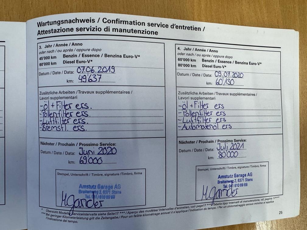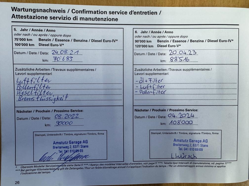 Letzte MFK am 15.01.2025 Letzter Service am 17.12.2024 bei 109'680Km 8-fach Bereifunk inkl. Alufelgen (Winterreifen ca. 3-4mm, Sommerreifen ca. 4-5mm Profiltiefe) Bekannte Mängel: - Dellen, Kratzer und Gebrauchsspuren (siehe Fotos) - Kein DAB - Bluetooth funktioniert nicht immer (nicht weiter untersucht) - AHK klemmt Kein Werkstatttest und keine Probefahrt durchgeführt! Aufgrund von Neukauf kann sich der Kilometerstand und die Verfügbarkeit verändern! Jede Gewährleistung, soweit nach gesetz möglich, wird wegbedungen. Insbesondere sind Wandelung und Minderung ausgeschlossen.