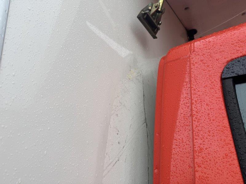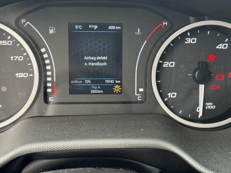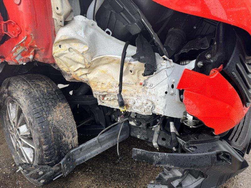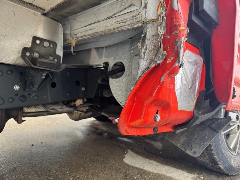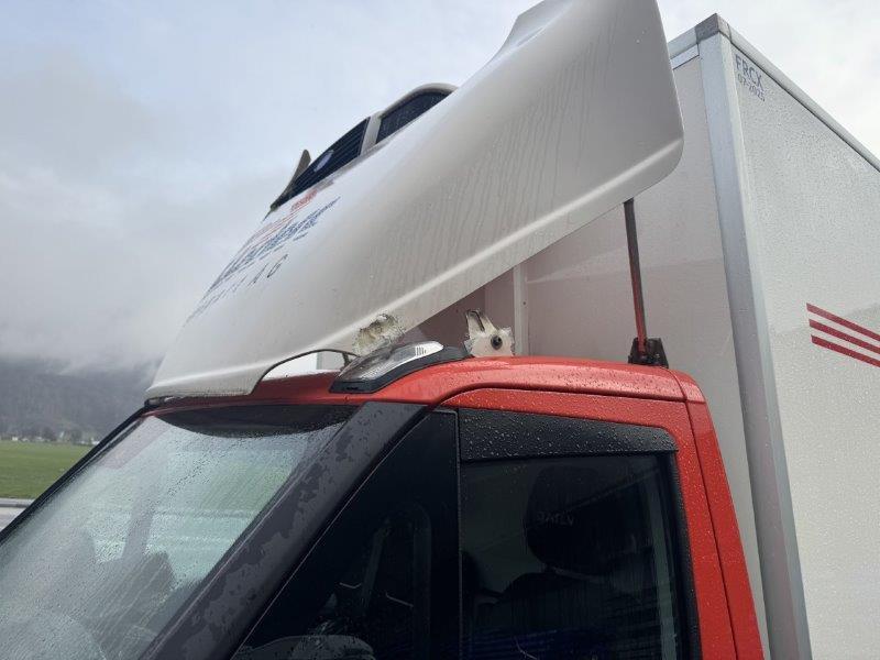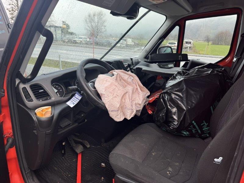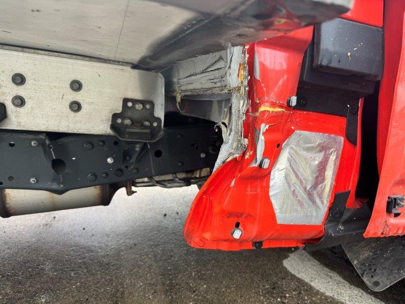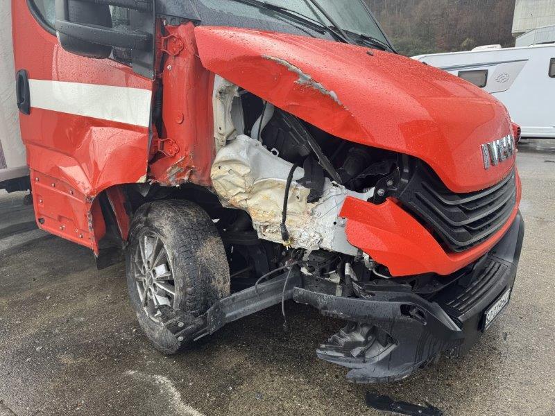 Längsholm rechts im Bereich Vorderachse und Kofferbau deformiert. Ganze rechte Fahrzeugseite deformiert, Türe rechts lässt sich nicht schliessen, A-Säule deformiert. Vorderachse deformiert. Airbag in der Fahrgastzelle ausgelöst inkl. Gurtstraffer. Motor lässt sich nicht starten. Frontscheibe gerissen. Achtung!!! Kofferaufbau wird demontiert!!!