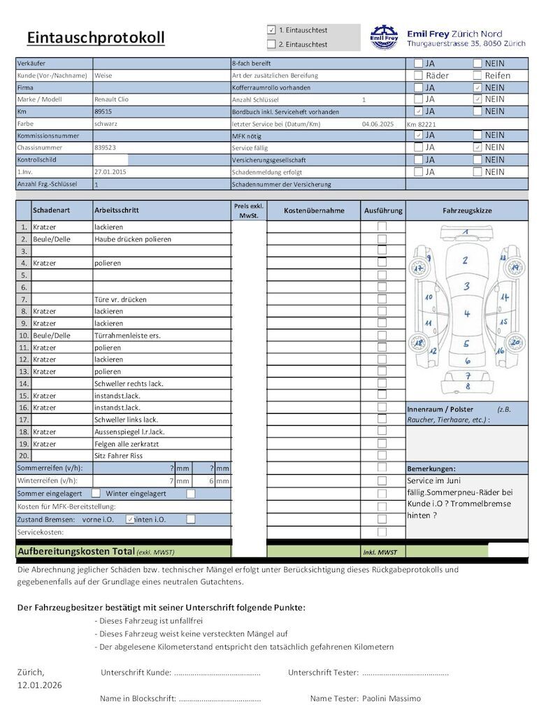 Keine technische Prüfung (Werkstatttest) vorgenommenDiverse Schäden an Karosserie/Lack.Fahrzeug ab Platz, ohne Garantie und Aufbereitung.DPF/FAP Filter nicht kontrolliertKeine Gewähr auf die Angaben der Sonder- und Serienausstattung / keine mechanische Prüfung. Fahrzeug wurde unzerlegt expertisiert / keine Haftung für allfällige, nach Demontage bekanntwerdenden Mängel. Fahrzeugbereifung und Ausstattung gemäss Fotos / Fahrzeugkauf auf eigenes Risiko ab Platz ohne Nachwährschaft.- Div. Kratzer und Dellen am gesamten Fahrzeug