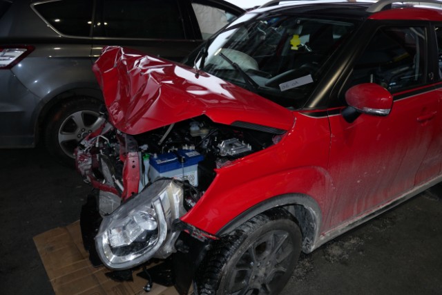 Front eingedrückt. Front links eingedrückt. Front rechts eingedrückt. Frontblech/Maskenblech eingedrückt. Radhaus vorne rechts eingedrückt / gestaucht. Längsträger vorne rechts gestaucht. Fahrzeugvorbau verschoben.