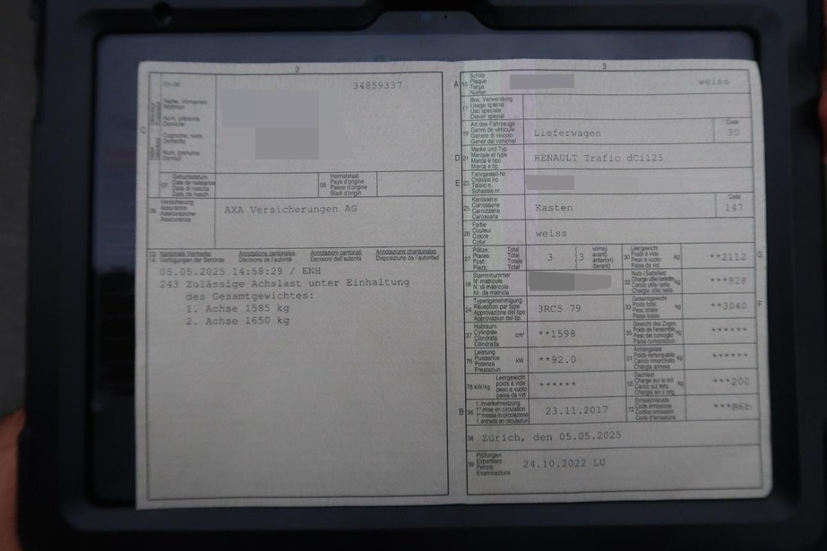 Digital Uhr, Info-Display, Ablagefach, Airbag: Fahrerairbag, Türen: Flügeltüren hinten 180°, verblecht, Leuchtweitenregulierung von innen, Getriebe: 6-Gang-Getriebe, Eco-Mode, Leseleuchten vorne, 12-Volt-Steckdose vorne, Kreuzstütze für Fahrersitz verstellbar, Seitenwand hinten rechts+links verblecht, Beleuchtetes und abschliessbares Handschuhfach, Lichtwarnsummer, Getönte Scheiben, Schiebetüre rechts, Drehzahlmesser, Innenverkleidung des Laderaumes halbhoch, Scheibenwischer vorne mit Intervall, Pollenfilter (Staubfilter), Polster: Stoff-Ausstattung, Sitze: Beifahrer Doppelsitzbank, Armlehne für Fahrersitz, Zentralverriegelung mit Fernbedienung, Stopp-/Start-System, Tageskilometerzähler, Assist: Anhänger-Stabilitätsprogramm, Berganfahrhilfe, Tagfahrlicht, 3-Knopf-Schlüssel, Bremsassistent (BAS), Elektrische Fensterheber vorne mit Impulsfunktion Fahrerseite Impulsfunktion Fahrerseite, 3-Punkt-Sicherheitsgurte auf allen Plätzen, Gurtstraffer vorne, Antiblockiersystem (ABS), Media: Bordcomputer, Weisse Blinkleuchten, Partikelfilter und Oxydationskatalysator, Licht: Nebelschlussleuchte, Sitze: Fahrersitz höhenverstellbar, Innenbeleuchtung im Laderaum, Renault Garantie: 3 Jahre oder 100'000 km (ab 1. Inv.), Wegfahrsperre elektronisch, Radiovorbereitung, Dachantenne und, Lenkrad längs- und höhenverstellbar, Trennwand mit Fenster und Durchladeluke, Stahlräder 16J, Aussenspiegel rechts und links beheizbar und elektrisch verstellbar, Befestigungsösen im Laderaum 8 Stk. bei L1, 10 bei L2, Kopfstützen vorne höhenverstellbar, Ablagen in den Türen, Laderaumabdeckung, Lenkrad: Servolenkung, Radio R&GO Bluetooth, Lenkradbedienung, AUX, USB, Elektronisches Stabilitäts-Programm und Antriebsschlupfregelung, Aussentemperaturanzeige, Drittes Bremslicht