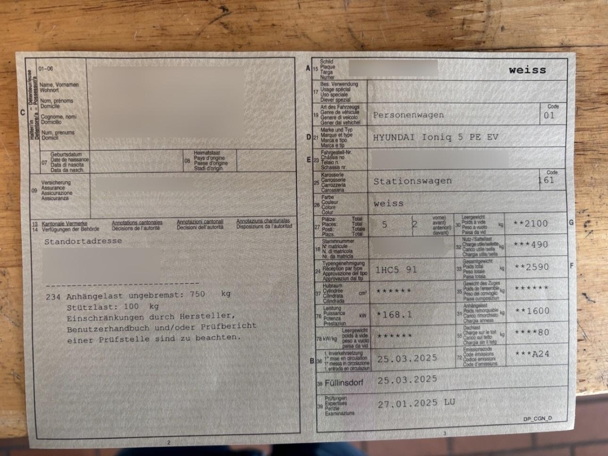 Media: Telematikdienst Bluelink (3 Jahre gratis), Virtuelles Motorengeräusch VESS, Sitze: Höhenverstellbare Vordersitze, Licht: LED-Tagfahrlicht, Airbag: Deaktivierung Frontairbag Beifahrerseite, Garantie: Hochvoltbatterie: 8 Jahre / 160 000 km, Lenkrad: Lenkradheizung, Automatisch abblendender Innenspiegel, Akustik-Verbundglas vorne und hinten, Schnellladeanschluss CCS bis zu 350 kW, ISOFIX Kindersitzvorrichtung, 12-Volt-Steckdose vorne, Assist: Spurhalteassistent, 3-Punkt-Sicherheitsgurte auf allen Plätzen, Media: Kabelloses Laden für Smartphone, Licht: LED-Rückleuchten im Pixel-Design, Licht: Fernlichtassistent, Licht: Lichtautomatik, Gepäckraumbeleuchtung vorne und hinten, Media: 2x USB-Anschluss hinten, Media: Android Auto - und Apple CarPlay -Funktion, Haifischantenne, Räder: Reifendruck-Kontrollsystem High Line, Elektronisches Stabilitätsprogramm ESP mit Multikollisionsbremse, Elektrisch verstell- und heizbare Aussenspiegel mit integrierten LED-Seitenblinkern, ABS mit elektronischer Bremskraftverteilung EBD, Assist: Berganfahrhilfe, Fensterheber vorne und hinten elektrisch, Media: 6 Lautsprecher, Assist: Rückfahrkamera mit digitalem Rückspiegel, Assist: Notbremsassistent mit Fussgänger-/Fahrraderkennung und Abbiegefunktion, Wegfahrsperre elektronisch, Assist: Automatisches Notrufsystem eCall, Servolenkung, Airbag: Front- und Seitenairbags vorne, Lenkrad: Lederlenkrad längs- und höhenverstellbar, Media: 3x USB-Anschluss vorne, Garantie: Garantie 12 Jahre gegen Durchrostung, Assist: Regensensor, Räder: Reifenreparatur-Set, Räder: 19'' Leichtmetallfelgen 235/55R19, 7,5x19J, Ladegerät (On-Board Charger) dreiphasig bis zu 11 kW, Media: Digitalradio DAB+, Media: Multi-Bluetooth mit Freisprecheinrichtung, Wärmedämmende Frontscheibe, Media: Navigationssystem mit 12.3"-Touchscreen, Airbag: Center Airbag vorne, Getriebe: Direktantrieb, kein Getriebe, V2L-Technologie: 230V-Steckdosen innen und aussen (via Adapter), Drive Mode Select, Lenkrad: Wippen am Lenkrad für regeneratives Bremsen, Gepäckraumrollo, Polster: Stoff-Ausstattung, Assist: Autobahn- und Stauassistent, Anfahralarm Vorderfahrzeug, Assist: Aktiver Totwinkelassistent, Manuell ausklappende Türgriffe, Fensterheber vorne mit Auf-/Abwärtsautomatik und Einklemmschutz, Licht: LED-Scheinwerfer im Pixel-Design, Assist: Einparkhilfe vorne und hinten, Aussenspiegel und Türgriffe in Wagenfarbe, Media: MapCare Lifetime - lebenslange Updates (exkl. Arbeitsleistung), Privacy Glass, abgedunkeltes Scheibenglas hinten (ab B-Säule), Batterieheizsystem, Lackierung: Pearl-Lackierung Lucid Blue, Assist: Tempomat mit Geschwindigkeitsbegrenzer, Assist: Aufmerksamkeitsassistent, Sitze: Lendenwirbelstütze Fahrersitz, pneumatisch einstellbar, Sitze: Sitzheizung vorne, Akustik-Frontscheibe, Hochvoltbatterie mit 800 V-Technologie (400 V-kompatibel), Insassenalarm, Garantie: 5 Jahre ohne Kilometerbegrenzung, ICCB-Ladekabel mit Typ 12-Stecker, Schlüsselloses Zugangs- und Startsystem Smart Key, Vorbereitung für Anhängevorrichtung (ohne 13-polige Steckdose), 12 Volt-Steckdose im Laderaum, Mittelarmlehne hinten mit Getränkehalter, Klima: 2-Zonen-Klimaautomatik mit Anti-Beschlagsystem, Sitze: Elektrisch verstellbarer Fahrersitz, Airbag: Vorhangairbags vorne und hinten, Assist: Elektronische Traktionskontrolle (ASR/TCS), Assist: Elektrische Parkbremse mit Auto-Hold-Funktion, Digitale Armaturentafel mit 12.3'' TFT LCD Anzeige, Sitze: Rücksitze getrennt abklappbar (60/40), Zentralverriegelung, Media: Audio-Fernbedienung am Lenkrad