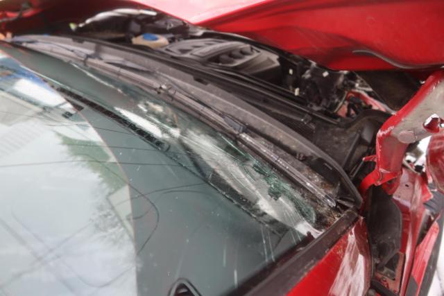 Fussgängerschutz ausgelöst. Front eingedrückt. Front links eingedrückt. Front rechts eingedrückt. Kotflügel vorne rechts eingedrückt. Kotflügel vorne links eingedrückt. Kotflügel vorne rechts und links eingedrückt. Motorhaube eingedrückt. Radhaus vorne rechts eingedrückt / gestaucht. Radhaus vorne rechts und links eingedrückt. Längsträger vorne rechts gestaucht. Längsträger vorne rechts und links gestaucht. Fahrzeugvorbau nach links verschoben.