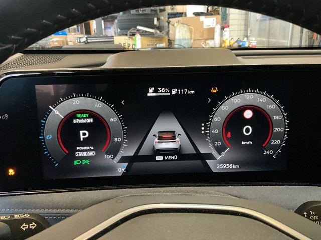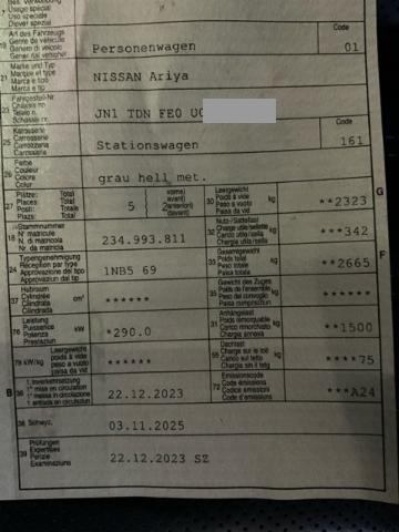 Airbag Fahrer und Beifahrerseite Sitzheizung vorne Sitzheizung hinten Elektrische Fensterheber vorne + hinten Heizbare Frontscheibe Lederlenkrad Innenspiegel automatisch abblendbar Aussenspiegel elektrisch verstellbar/ heizbar und anklappbar Rücksitze geteilt umklappbar 60/40 Lenksäule elektrisch verstellbar Ambientebeleuchtung Lenkrad beheizbar Sound System Bose Intelligent Key-System Rückfahrkamera Vorhangairbags Seitenairbags vorne Leichtmetallfelgen 20" Vordersitze elektrisch verstellbar mit Memory Elektronische Servolenkung Abgedunkelte Scheiben ab B-Säule Panorama-Glasschiebedach elektrisch Head-Up Display Elektr. Lendenwirbelstütze Fahrersitz USB-Schnittstelle Licht- und Regensensor Bluetooth Interface/ Schnittstelle Elektronische Parkbremse Vordersitze kühlbar Einparkhilfe vorne und hinten Einstiegsleisten mit Logo Spurhalteassistent LKA LED-Scheinwerfer LED Tagfahrlicht Virtuelle Instrumententafel/ TFT-Bildschirm 12.3" LED Rückleuchten Totwinkel-Assistent Details siehe gültige Preisliste des Importeurs Einparksystem/ automatisch Sitzbezüge in Nappa Leder Ladekabel Keine Gewähr auf die Angaben der Serienausstattungen Zwei Zonen-Klimaautomatik mit Pollenfilter WiFi On Board (Online) DAB+ Digital Audio Broadcast LED-Nebelscheinwerfer Adaptiver Fernlichtassistent 360° Kamera Heckklappe elektrisch mit Freihandfunktion Notbrems-Assistent Verkehrsschild-Erkennungssystem Stauassistent Wireless Charging für mobile Geräte Connect Apple Car Play/ Android Auto Müdigkeitserkennung Navigation Nissan Connect Wärmepumpe Garantie Batterie 8 Jahre/ 160'000 km USB-C Anschluss Innenspiegel digital