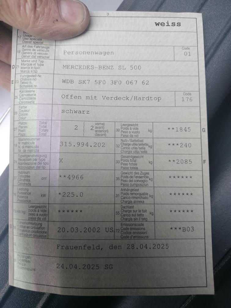 Gepflegter SL 500. Sommerreifen hinten Neu, Bremsen in Ordnung. Am Fahrzeug wurde keine vollumfängliche Prüfung der mechanischen Teile und der Carrosserie durchgeführt! Das Risiko liegt somit vollumfänglich beim Käufer. Um Missverständnisse zu vermeiden kann das Fahrzeug auf Voranmeldung besichtigt & getestet werden. Wird davon bewusst kein Gebrauch gemacht, liegt die Verantwortung beim Käufer. Nach Zuschlag, keine Nachverhandlungen möglich. Ab Platz ohne Garantie, Wandelung und Minderung werden wegbedungen. Kundenpreisvorstellung: 17500.-