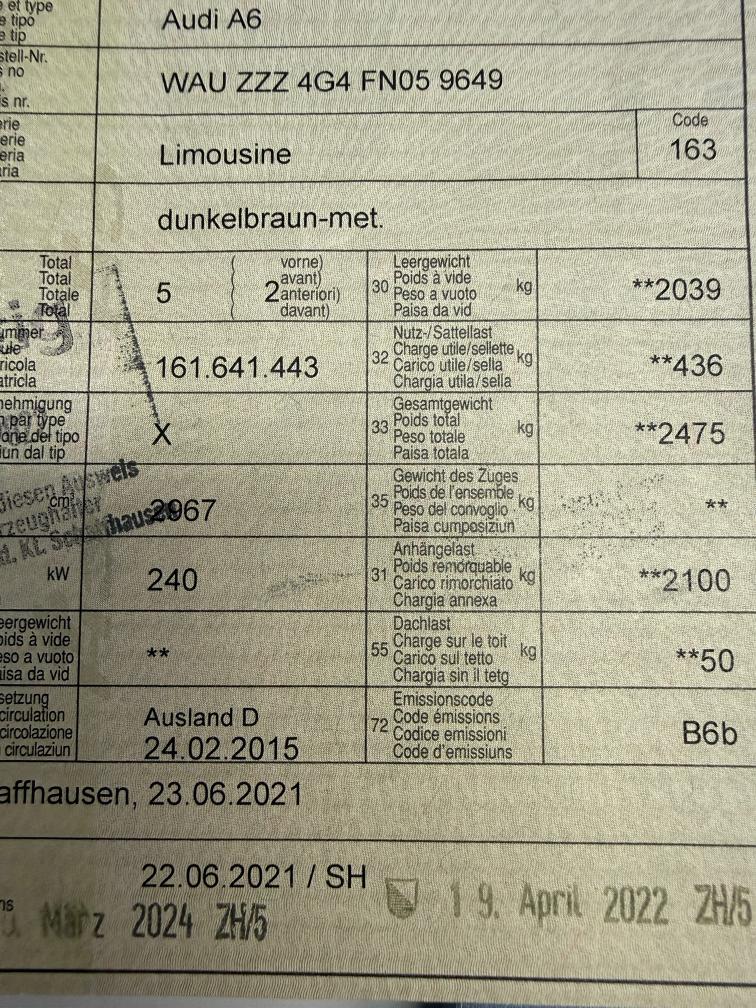 Am Fahrzeug wurde kein Werkstatttest gemacht (Für sichtbare oder nicht sichtbare Mängel wird nicht gehaftet). Wir testen & kontrollieren nicht alle Funktionen vom Fahrzeug. Das Risiko liegt somit vollumfänglich beim Käufer. Nachdem der Höchstbietende den Zuschlag erhalten hat, gibt es keine Nachverhandlung, auch wenn nicht deklarierte Mängel zum Vorschein kommen sollten. Ab Platz ohne Garantie, Wandelung und Minderung werden wegbedungen. _ Sonderausstattung gemäss Eurotax ohne Gewähr: _ Aussenspiegel rechts und links beheizt, elektrisch verstell-/ und einklappbar mit Memory, automatisch abblendend (CHF 710) Adaptive air suspension: elektronisch geregelte Luftfederung (CHF 1930) Anhängevorrichtung abschwenkbar (CHF 1380) Dynamiklenkung (CHF 1600) Durchladesystem inkl.Skisack (CHF 280) Vorder- und Rücksitze heizbar (CHF 1000) Elektrische Heckklappe (CHF 720) Airbag: Seitenairbags hinten (CHF 500) DVD-Wechsler (CHF 910) Polster: Erweiterte Leder-Ausstattung (CHF 960) Park Distance Control vorne und hinten (CHF 1090) Bose Soundsystem (CHF 1380) Klimatisierungsautomatik 4- Zonen (CHF 1020) Fahrer-Informationssystem mit Farbdisplay (CHF 550) Media: Audi Phone Box (CHF 580) Assist: Rückfahrkamera (CHF 630) Head-Up Display (CHF 1920) Komfortschlüssel inkl. sensorgesteuerter Gepäckraumentriegelung - inkl. Gepäckraumklappe elektrisch öffnend und schliessend, Diebstahlwarnanlage (CHF 2490) Sitze: Vordersitze elektrisch verstellbar, Fahrersitz mit Memory-Funktion (CHF 1350) Innen- und Aussenlichtpaket (CHF 390) Getönte Scheiben Privacy (CHF 630)