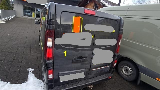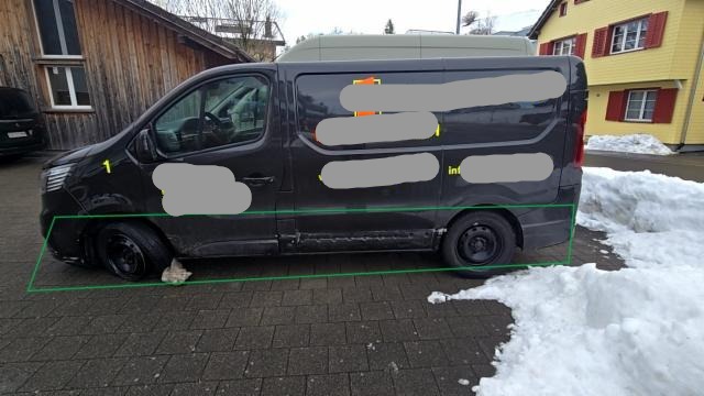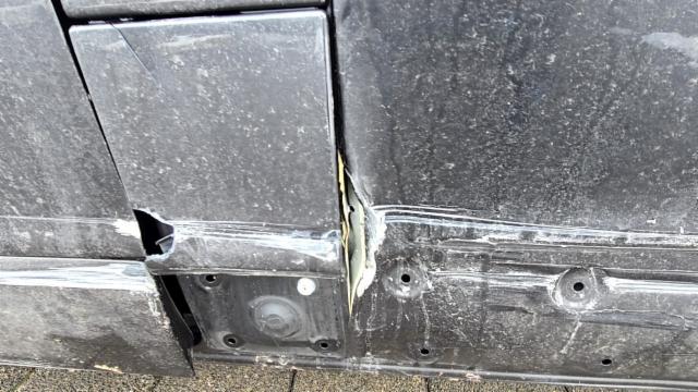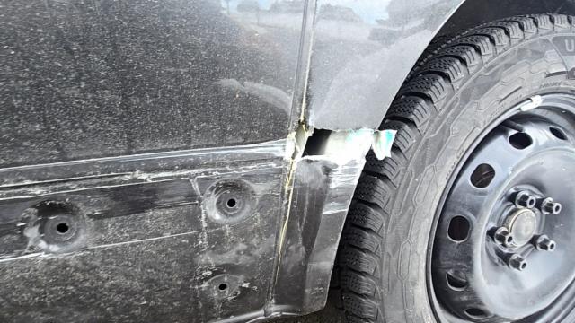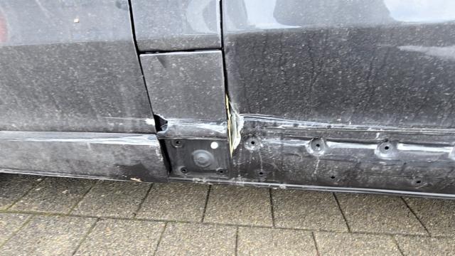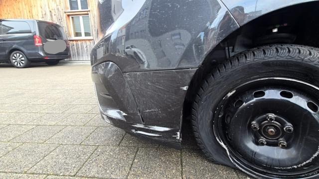 Linke Seite beschädigt. Anstoss links im Bereich der B-Säule. Tür vorne links ist eingedrückt.