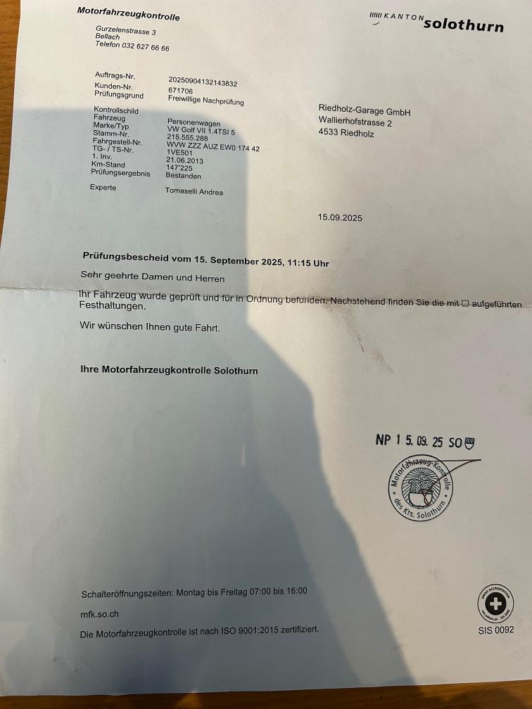 Am Fahrzeug wurde kein Werkstatttest gemacht (Für sichtbare oder nicht sichtbare Mängel wird nicht gehaftet). Wir testen & kontrollieren nicht alle Funktionen vom Fahrzeug. Das Risiko liegt somit vollumfänglich beim Käufer. Nachdem der Höchstbietende den Zuschlag erhalten hat, gibt es keine Nachverhandlung, auch wenn nicht deklarierte Mängel zum Vorschein kommen sollten. Ab Platz ohne Garantie, Wandelung und Minderung werden wegbedungen. Auf bei der Motorhaube ist der Lack nicht mehr schön • Motor 1.4 TSI / 140 PS Benzin • DSG-Automatikgetriebe • Parkhilfe vorne & hinten • 4-fach bereift • 2 Schlüssel • Radio/CD, Bluetooth, SD-Karten-Slot • 2-Zonen-Klimaautomatik • Sitzheizung • Isofix • Tempomat mit Radar-Abstandsregelung • Elektrische Feststellbremse • Elektrische Fensterheber • Frisch ab MFK