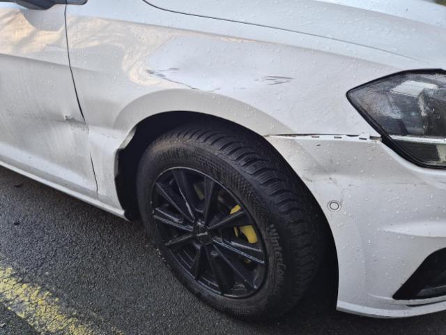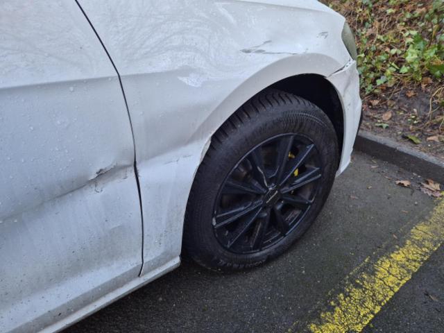 Kotflügel vorne rechts eingedrückt. Fahrzeugvorbau verschoben. Fahrzeugvorbau nach links verschoben.