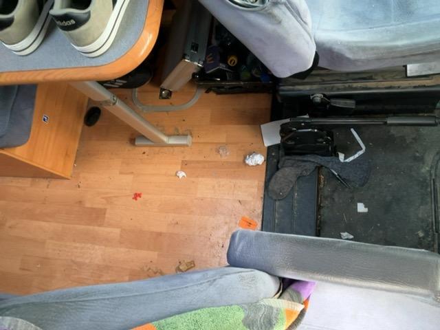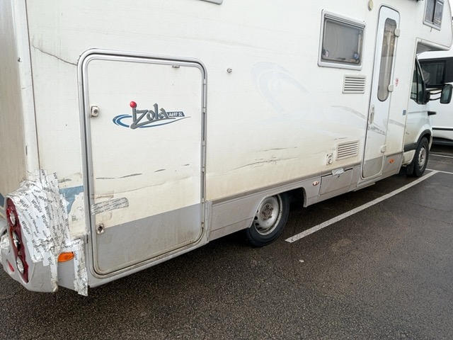 Arrière droit : Pare-chocs arrière centre, coin pare-chocs, support feux, feux, porte soute arrière, prise electrique, grille aération, feux de position, vitre paroi latérale, trape soute, etc...... liste non exhaustive / Dommages préexistants: Intérieur et extérieur très sale. Divers coups et rayures. Vorne rechts: Pare-chocs endommagé. Rétroviseur endommagé. Seite rechts: Garniture porte intérieur cassée. Store cassé. Hinten rechts. Vorne mitte. Toit très sale. Hinten mitte. Vorne links: Porte enfoncée. Seite links. Hinten links