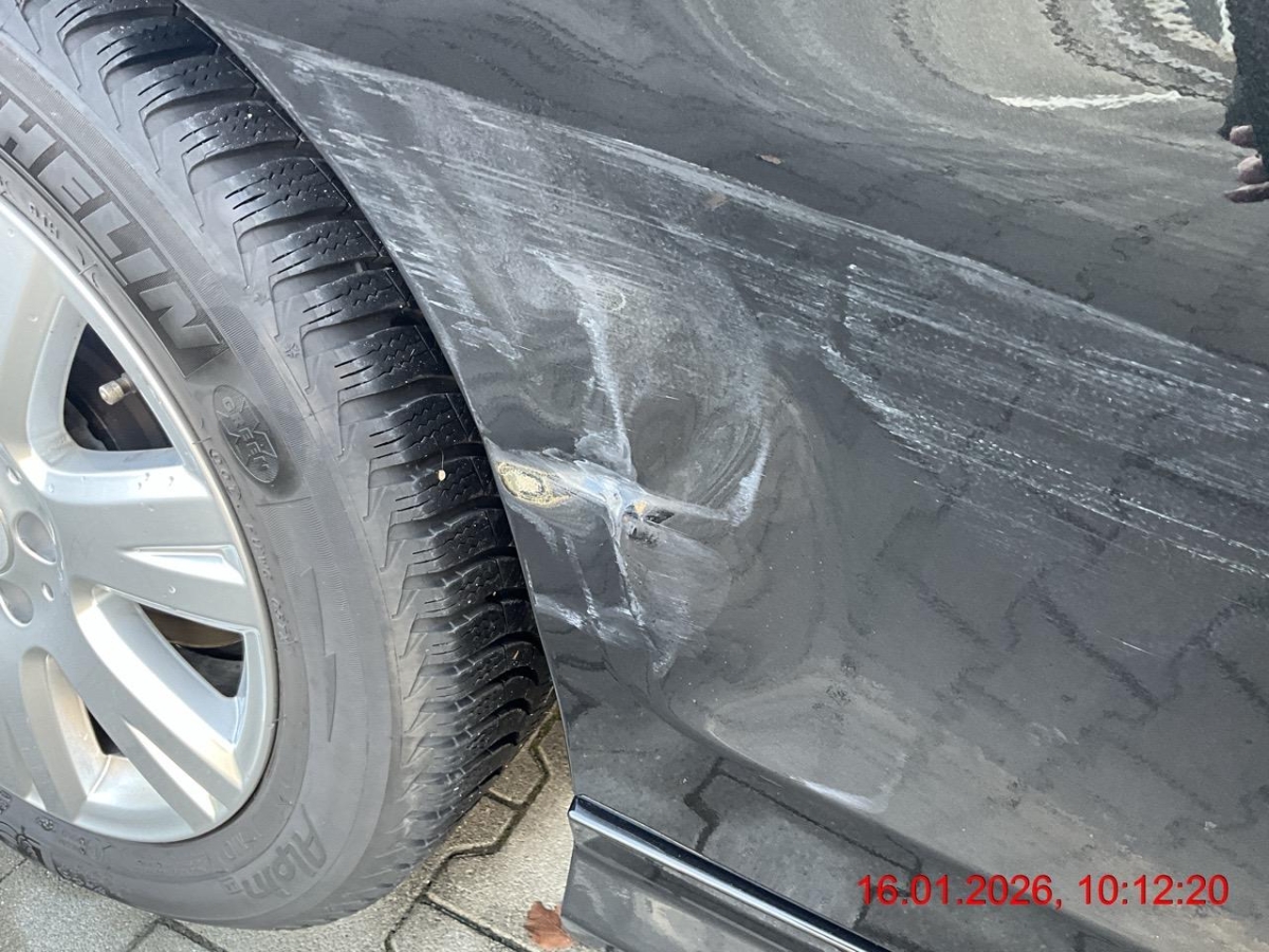 Beschreibung der Schäden: Seitenwand rechts deformiert. Stossfänger hinten und Felge hinten rechts zerkratzt. Fahrwerk hinten rechts verschoben.