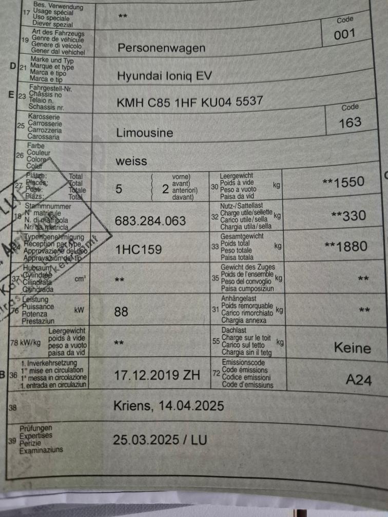 Frisch ab Service MFK im März 2025 ausgeführt. Hochvoltbatterie Garantie 8 Jahre / 200'000km ab 1. Inverkehrssetzung. Für sichtbare und nicht sichtbare Mängel wird nicht gehaftet. Keine Garantie, Keine Minderung und/oder Wandelung möglich. Keine Nachverhandlungen.