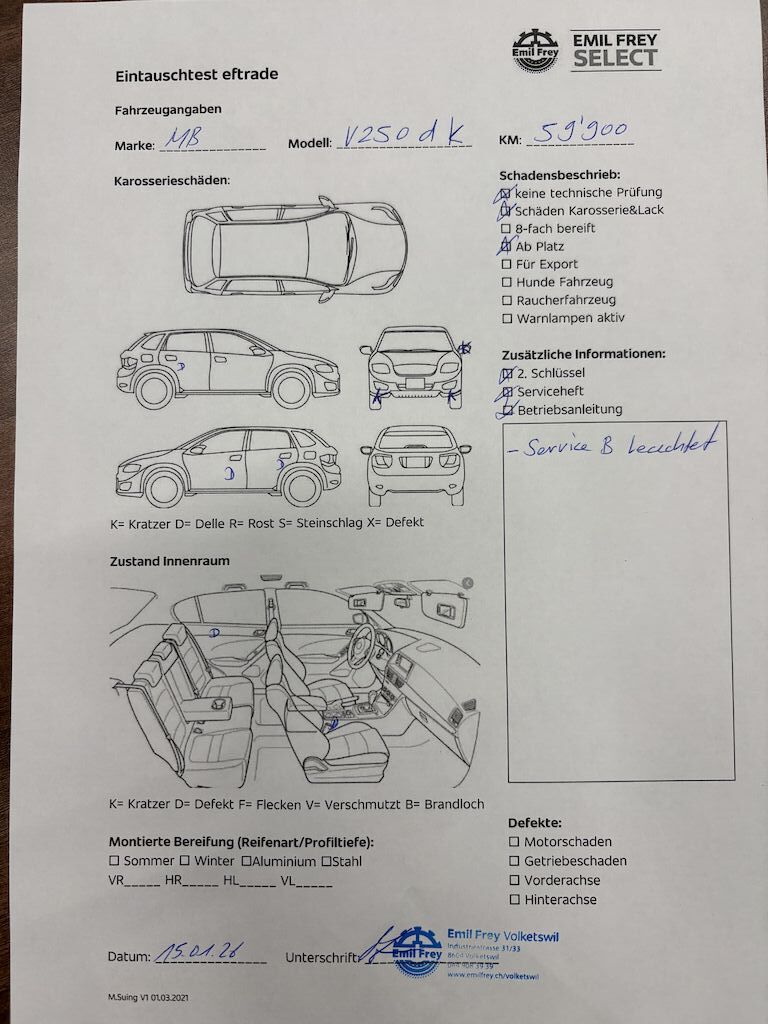 -CH Fahrzeug, Mercedes Swiss Integral-Service B leuchtet-Keine technische Prüfung (Werkstatttest) vorgenommen-Diverse Schäden an Karosserie/Lack.-Fahrzeug ab Platz, ohne Garantie und Aufbereitung.-DPF/FAP Filter nicht kontrolliert