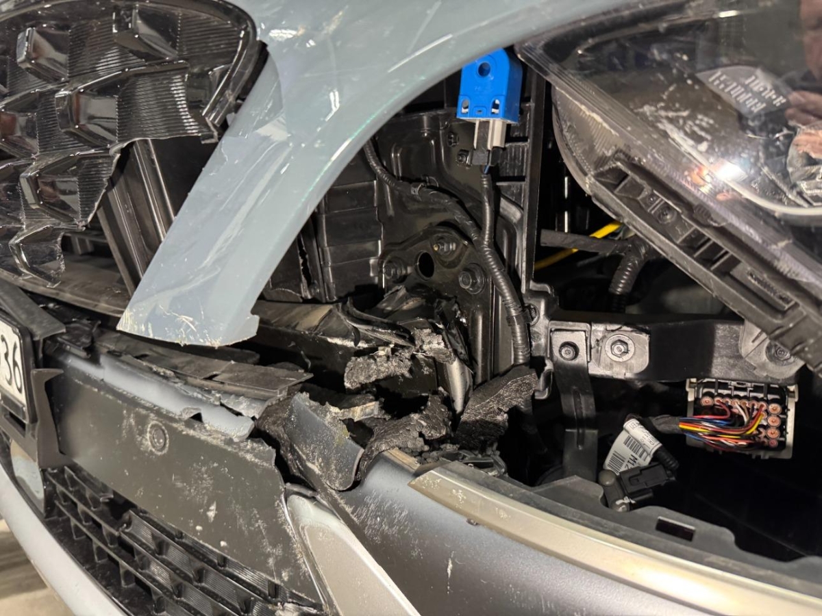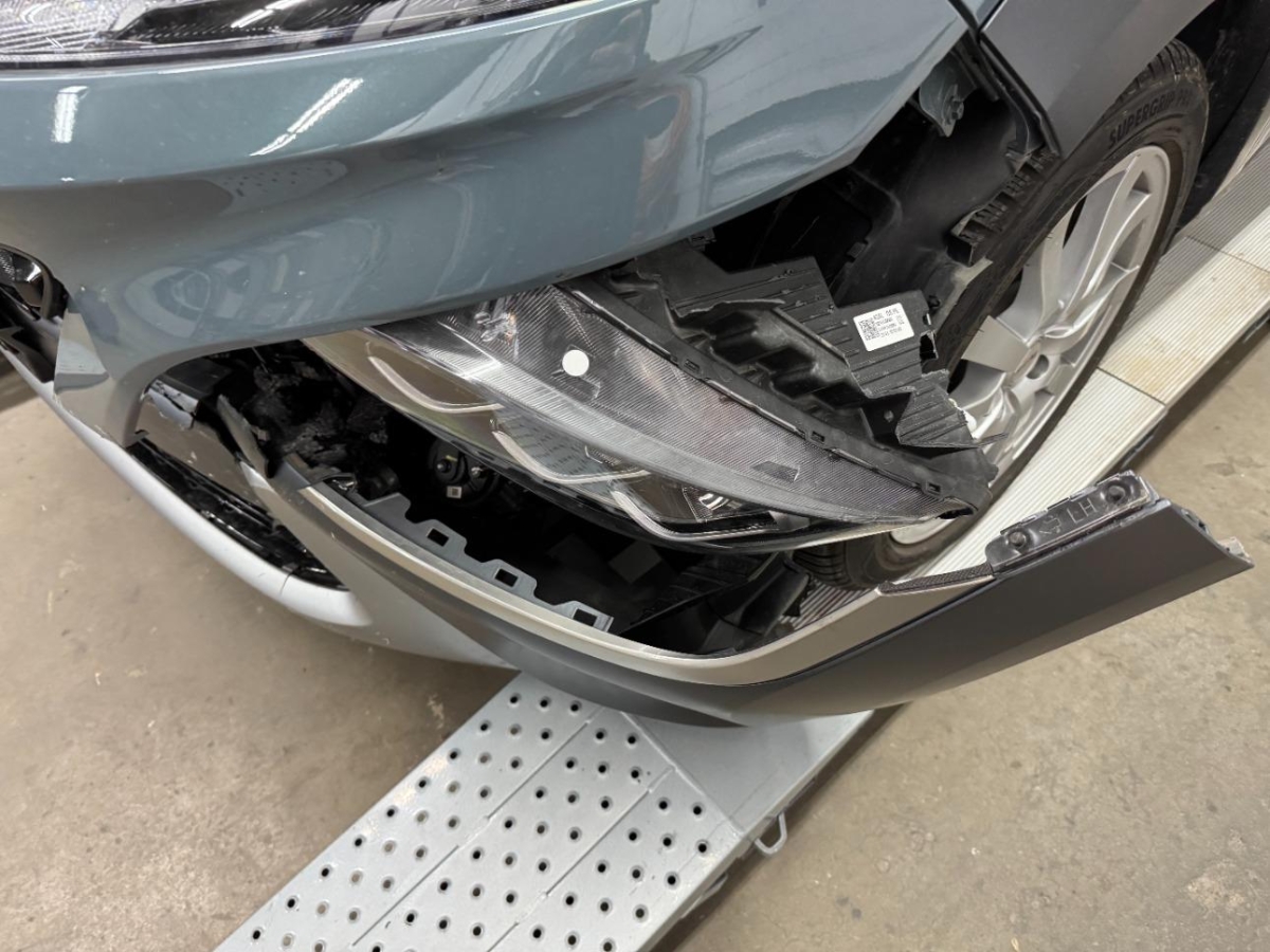 Airbag ausgelöst, Armaturenbrett, Front, Front links, Frontblech, Frontscheibe, Gurtstraffer ausgelöst, Klimakühler, Kotflügel links, Kühler, Kühlgitter, Radhaus vorne links, Scheinwerfer links, Stosstange vorne