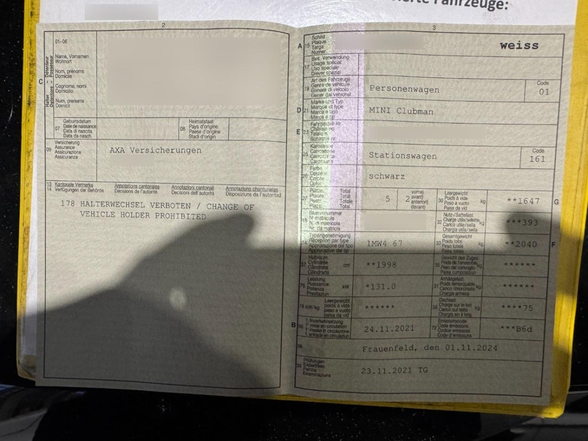 Innenraumbeleuchtung, Start-/Stop-Knopf, Media: DAB+ (Digital Audio Broadcasting), Drittes Bremslicht, Reifendruck-Kontrollanzeige, Steckdose 12V, Airbag: Window-Kopfairbags, Einstiegsschienen, Bremsassistent (BAS), Cupholder, Airbag: Airbag Fahrer und Beifahrer, Elektronische Parkbremse, Aussenspiegel in Wagenfarbe, Verbandskasten, Scheibenwaschdüsen beheizt, Nichtraucherausführung, TeleService, Abschliessbare Radschrauben, Cornering Brake Control (CBC), Heckspoiler, Airbag: Seitenairbag für Fahrer und Beifahrer, Sitze: Sportsitze vorne, Start/Stop-Funktion, Zentralverriegelung mit Fernbedienung, Durchladesystem, Media: Bluetooth Freisprecheinrichtung, Elektrische Fensterheber vorne, Licht: LED Nebelscheinwerfer, Scheibenwischer vorne mit Regensensor und automatischem Einschalten der Abblendlichter, Licht: Weisse Blinkleuchten Zusatzblinkleuchten, in Seitenwand vorne in Weiss, Licht: Nebelschlussleuchte, Media: Radio MINI Visual Boost - 8,8" Touch-Display, Radio mit RDS-Doppeltune, Antennen-Diversity, Freisprecheinrichtung Bluetooth MINI Connected. Kein internes CD-Laufwerk. Bedienung über MINI Controller in der Mittelkonsole. Inkl. DAB+ Tuner und 6 Lautsprechern mit insgesamt 150 Watt Ausgangsleistung. Touch-Screen und Multifunktionstasten am Lenkrad möglich, Dachhimmel in grau, Sitze: Rücksitzlehne geteilt abklappbar, Gurtstraffer vorne, Lenkrad: Multifunktion für Lenkrad, Heckscheiben-Wisch-/Waschanlage mit, Licht: Abblendlichtausschaltverzögerung 'Follow me home', Aussenspiegel rechts und links elektrisch verstell- und beheizbar und Scheibenwaschdüsen beheizbar, Heckscheibenheizung, Traffic Information, Bordcomputer, Lenkrad: Lenkrad längs- und höhenverstellbar, ISOFIX Kindersitzvorrichtung, Dynamische Bremsleuchten, Kopfstützen hinten, 3-Punkt-Sicherheitsgurte auf allen Plätzen, Airbag Beifahrer deaktivierbar, Elektronischer Bremskraftverteilung EBD, Antiblockiersystem (ABS), Dachspoiler, Chromrahmen um Scheinwerfer und Rückleuchteneinheit, Katalysator geregelt, Getriebe: Allradantrieb permanent, Wegfahrsperre elektronisch, Türgriffe aussen verchromt, Dekor: Interieuroberfläche Piano Black - Cockpitleiste umlaufend Piano Black, Cockpitdekorleiste Black Chequered, Türdekorleiste Piano Black, Mittelkonsolenleisten Piano Black, Dynamische Stabilitätskontrolle (DSC), Ablagefach, Licht: LED Scheinwerfer, Wärmeschutzverglasung, Chromleiste an der Unterkante aller Scheiben, umlaufend, Media: USB-Anschluss, Intelligenter Notruf, Sitze: Vordersitze höhenverstellbar, Dynamische Traktionskontrolle (DTC), Befestigungsösen im Laderaum, Türgriffe innen verchromt, Drehzahlmesser, Leuchtweitenregulierung elektrisch, Lackierung: Metallic-Lackierung Moonwalk Grey, Lenkrad: Sport-Lederlenkrad, Licht: Tagfahrlicht, Getriebe: 8-Stufen-Automat sequentiell, Crash-Sensor, Servotronic, Laderaumbeleuchtung, MINI Mobility System, Bremsenergie-Rückgewinnung, Dekor: Colour Line Carbon Black
